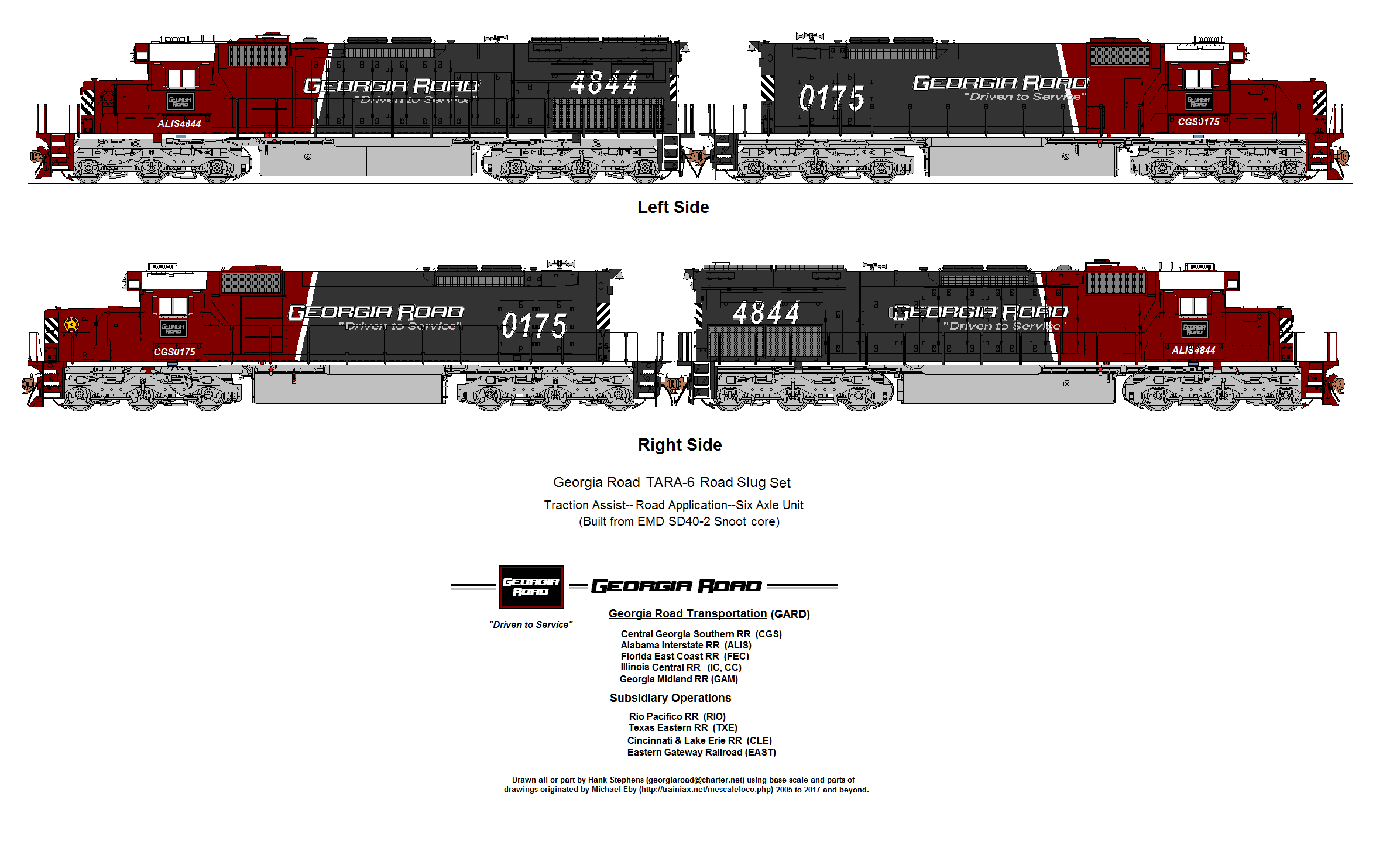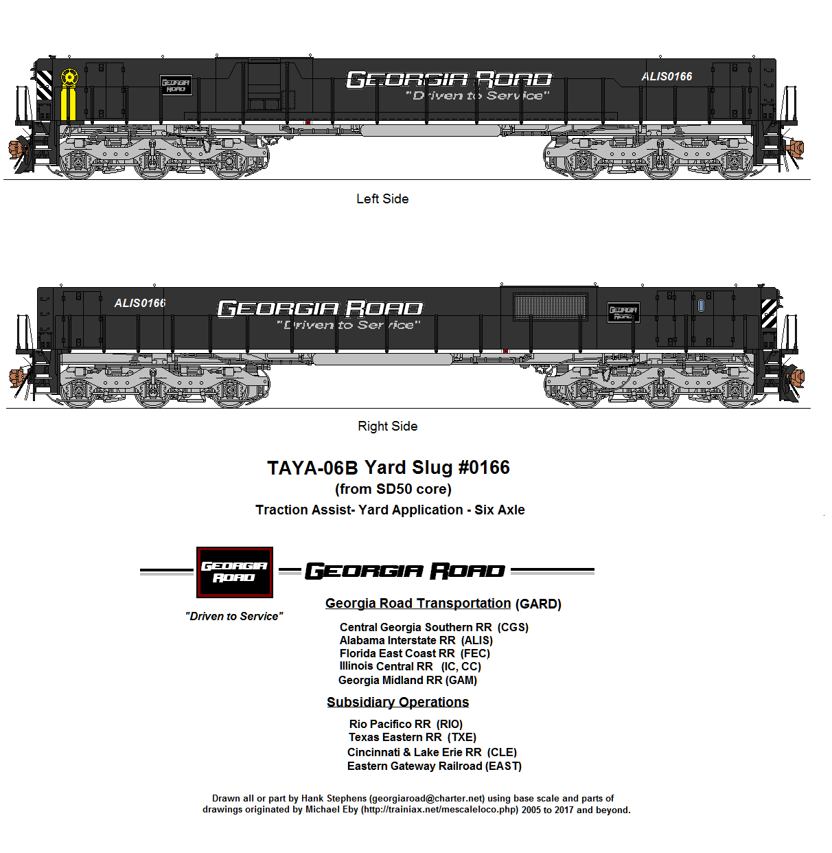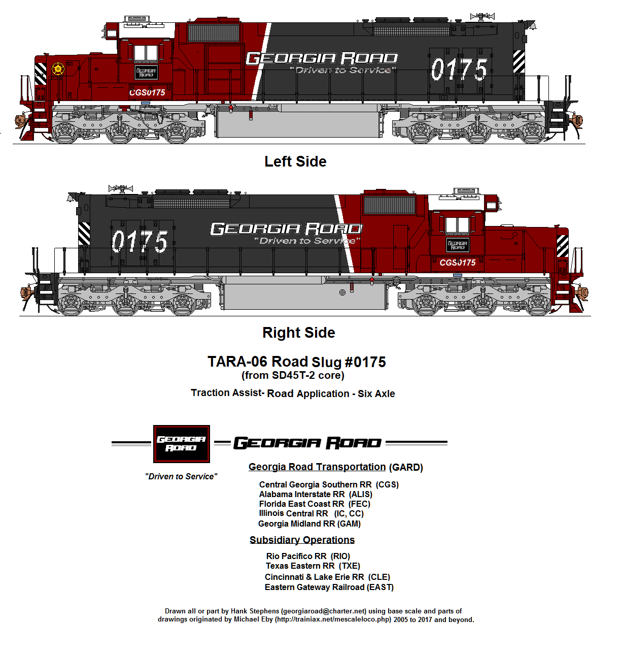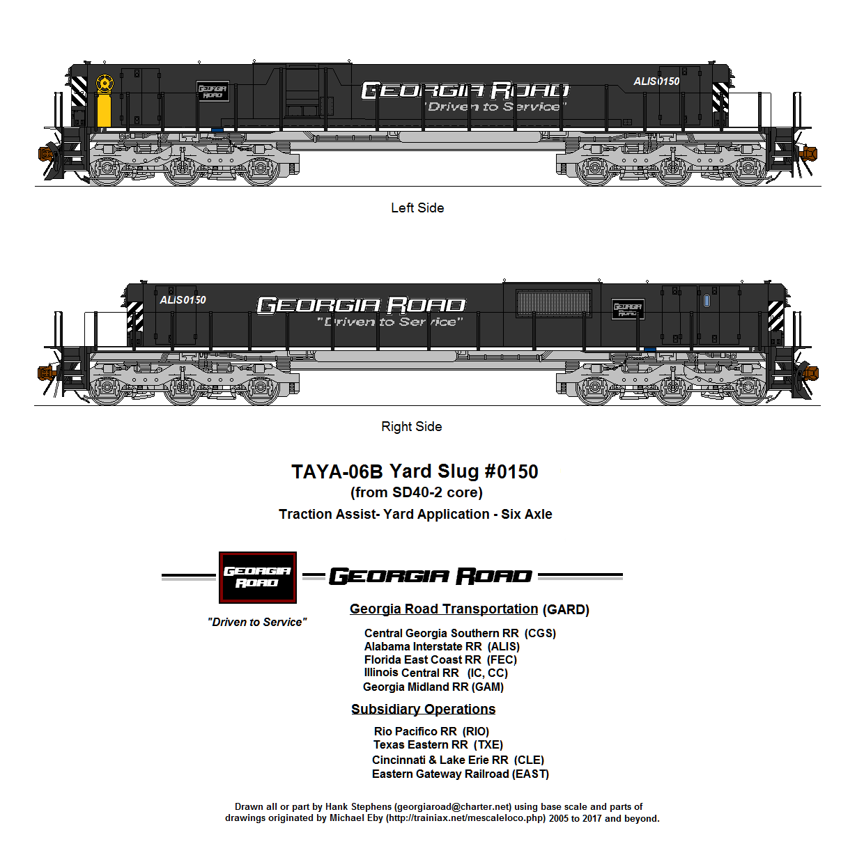 The core group of Georgia Road slugs came from a group of eight ex-Union Pacific Railroad (UP) slugs inherited by predecessor Central Alabama & Southern Railroad (CA&S). CA&S acquired these from various scrappers, rebuilding them and assigning them to the former NS Norris Yard classification yard in Macon, GA and various flat yards around its original ex-CofGA trackage. By the time of the Georgia Road assumption of the CA&S estate, most were out of service due to heavy maintenance needs typically deferred by the CA&S in its final days. Georgia Road restored these slugs to service, but soon found the mostly 4 axle fleet was sorely outmoded for the increasingly heavy railcars and trains they regularly worked in the yards. As a result, Georgia Road commissioned the completion of modern slug conversions of various six axle cores. The largest group was several SD40-2 cores configured into TAYA-06B slugs for use with ex Southern high hood SD40-2s used in heavy switching where the high short hood did not create a disadvantage and as a result did not need immediate shopping a chop nose and upgraded cab. These units replaced GP9B TAYA-4B slugs that were eventually completely rebuilt for road service as TARA-4B units mated to GP40M-3 rebuilds.