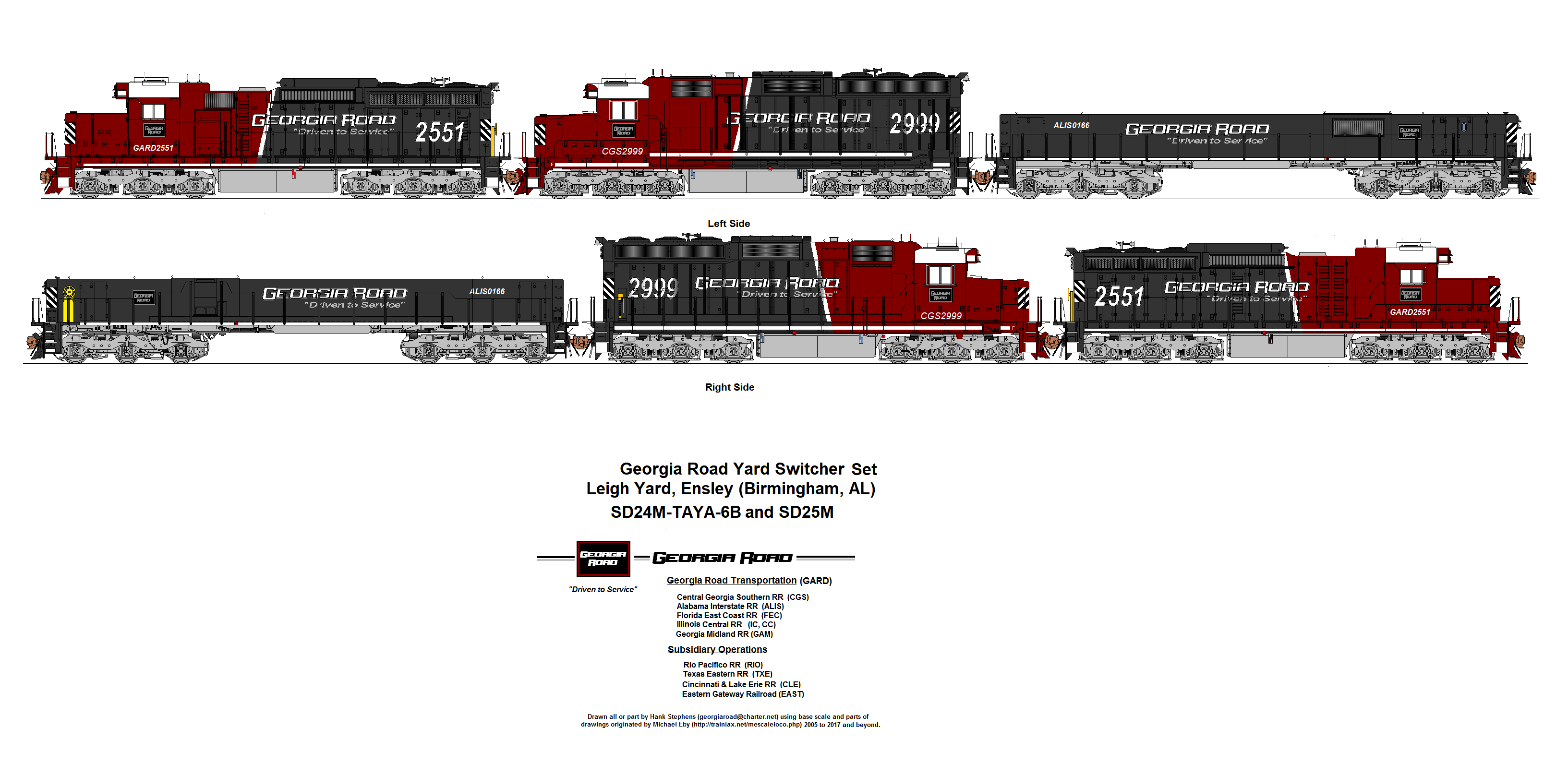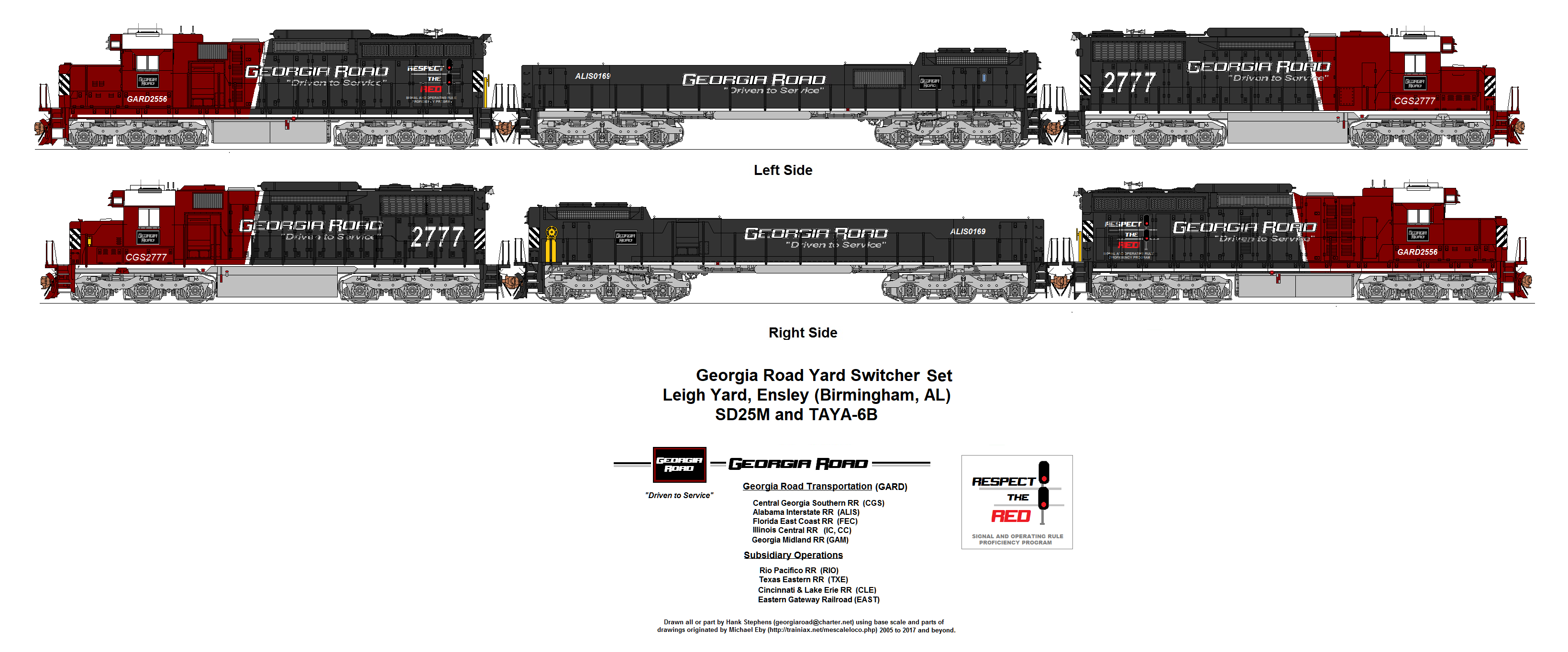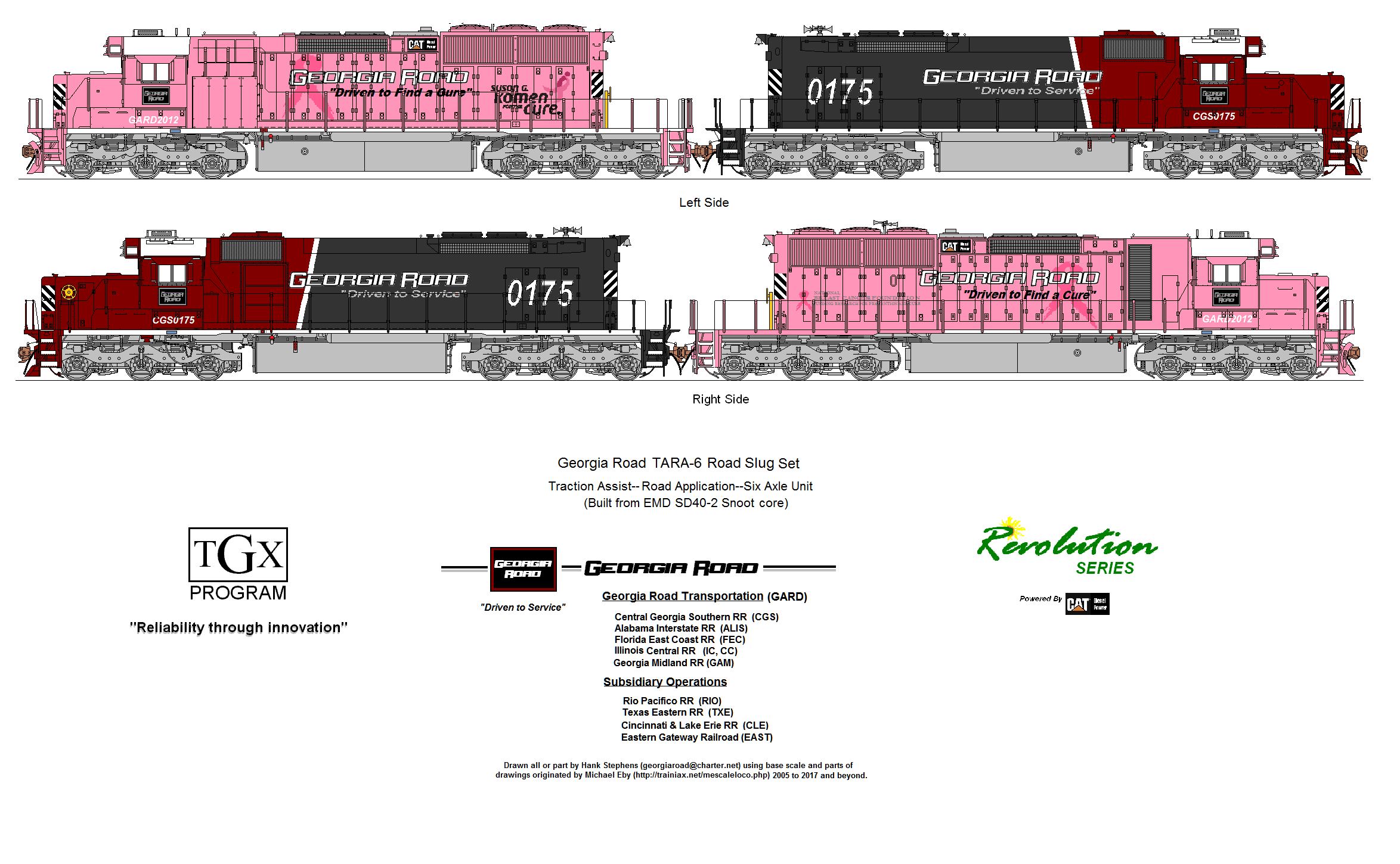 The core group of Georgia Road slugs came from a group of eight ex-Union Pacific Railroad (UP) slugs inherited by predecessor Central Alabama & Southern Railroad (CA&S). CA&S acquired these from various scrappers, rebuilding them and assigning them to the former NS Norris Yard classification yard in Macon, GA and various flat yards around its original ex-CofGA trackage. By the time of the Georgia Road assumption of the CA&S estate, most were out of service due to heavy maintenance needs typically deferred by the CA&S in its final days. Georgia Road restored these slugs to service, but soon found the mostly 4 axle fleet was sorely outmoded for the increasingly heavy railcars and trains they regularly worked in the yards. As a result, Georgia Road commissioned the completion of modern slug conversions of various six axle cores. The largest group was several SD40-2 cores configured into TAYA-06B slugs for use with ex Southern high hood SD40-2s used in heavy switching where the high short hood did not create a disadvantage and as a result did not need immediate shopping a chop nose and upgraded cab. These units replaced GP9B TAYA-4B slugs that were eventually completely rebuilt for road service as TARA-4B units mated to GP40M-3 rebuilds.