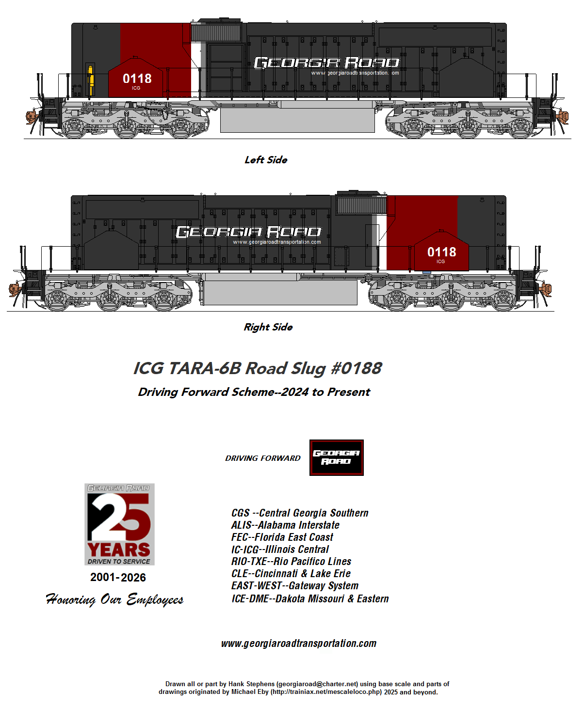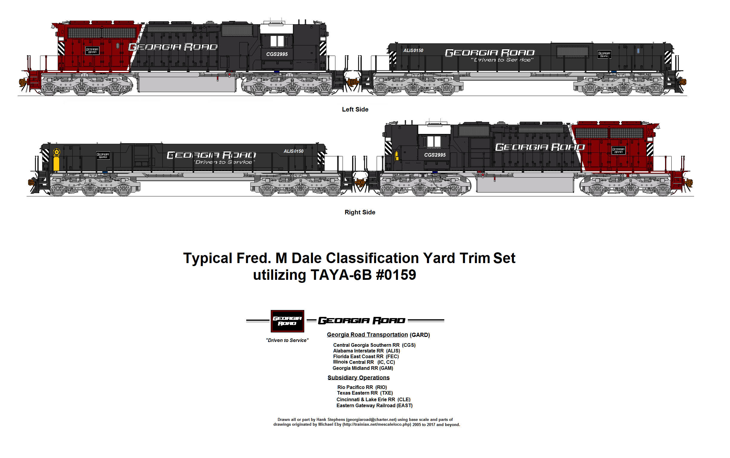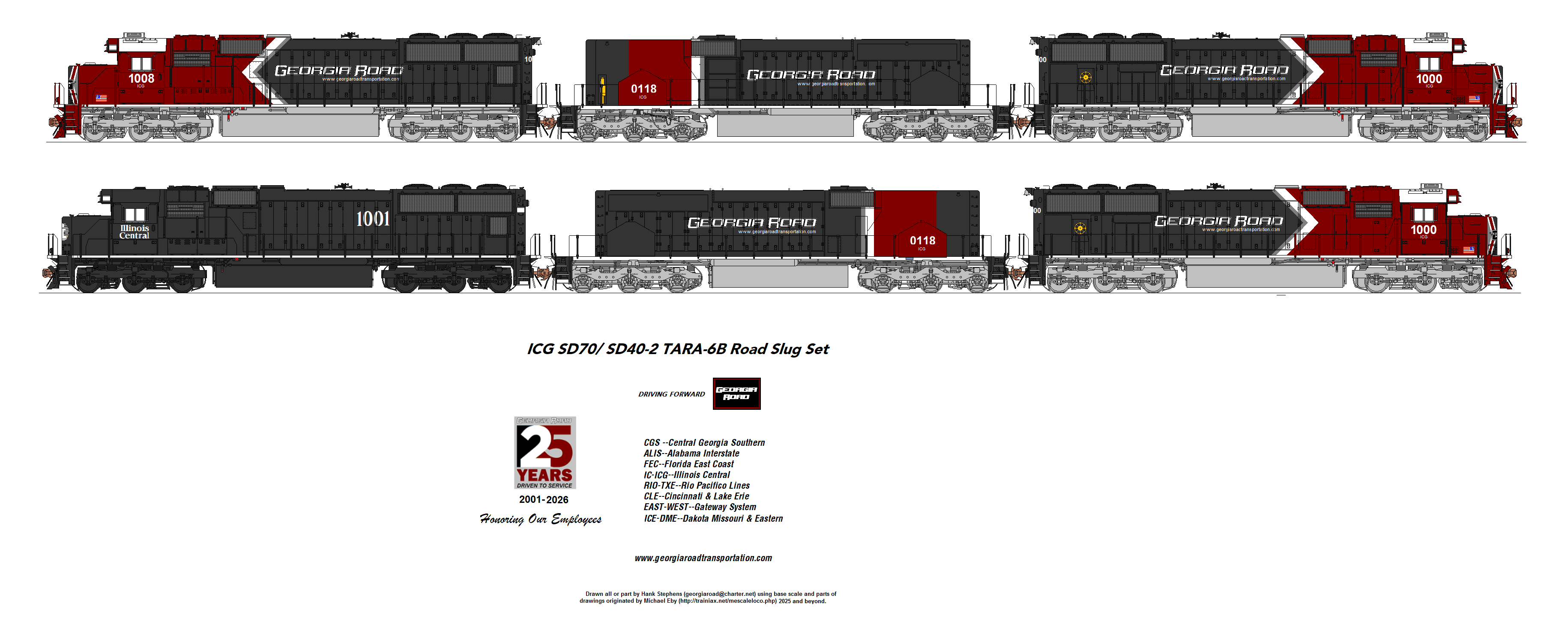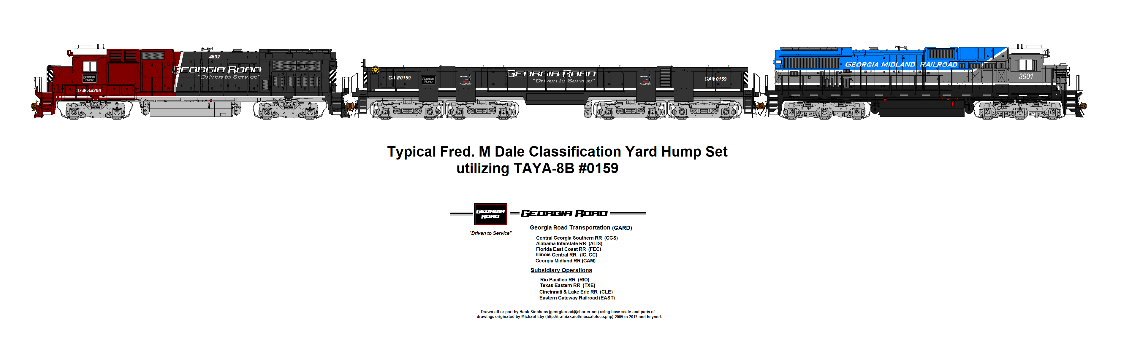 The core group of Georgia Road slugs came from a group of eight ex-Union Pacific Railroad (UP) slugs inherited by predecessor Central Alabama & Southern Railroad (CA&S). CA&S acquired these from various scrappers, rebuilding them and assigning them to the former NS Norris Yard classification yard in Macon, GA and various flat yards around its original ex-CofGA trackage. By the time of the Georgia Road assumption of the CA&S estate, most were out of service due to heavy maintenance needs typically deferred by the CA&S in its final days. Georgia Road restored these slugs to service, but soon found the mostly 4 axle fleet was sorely outmoded for the increasingly heavy railcars and trains they regularly worked in the yards. As a result, Georgia Road commissioned the completion of modern slug conversions of various six axle cores. The largest group was several SD40-2 cores configured into TAYA-06B slugs for use with ex Southern high hood SD40-2s used in heavy switching where the high short hood did not create a disadvantage and as a result did not need immediate shopping a chop nose and upgraded cab. These units replaced GP9B TAYA-4B slugs that were eventually completely rebuilt for road service as TARA-4B units mated to GP40M-3 rebuilds.