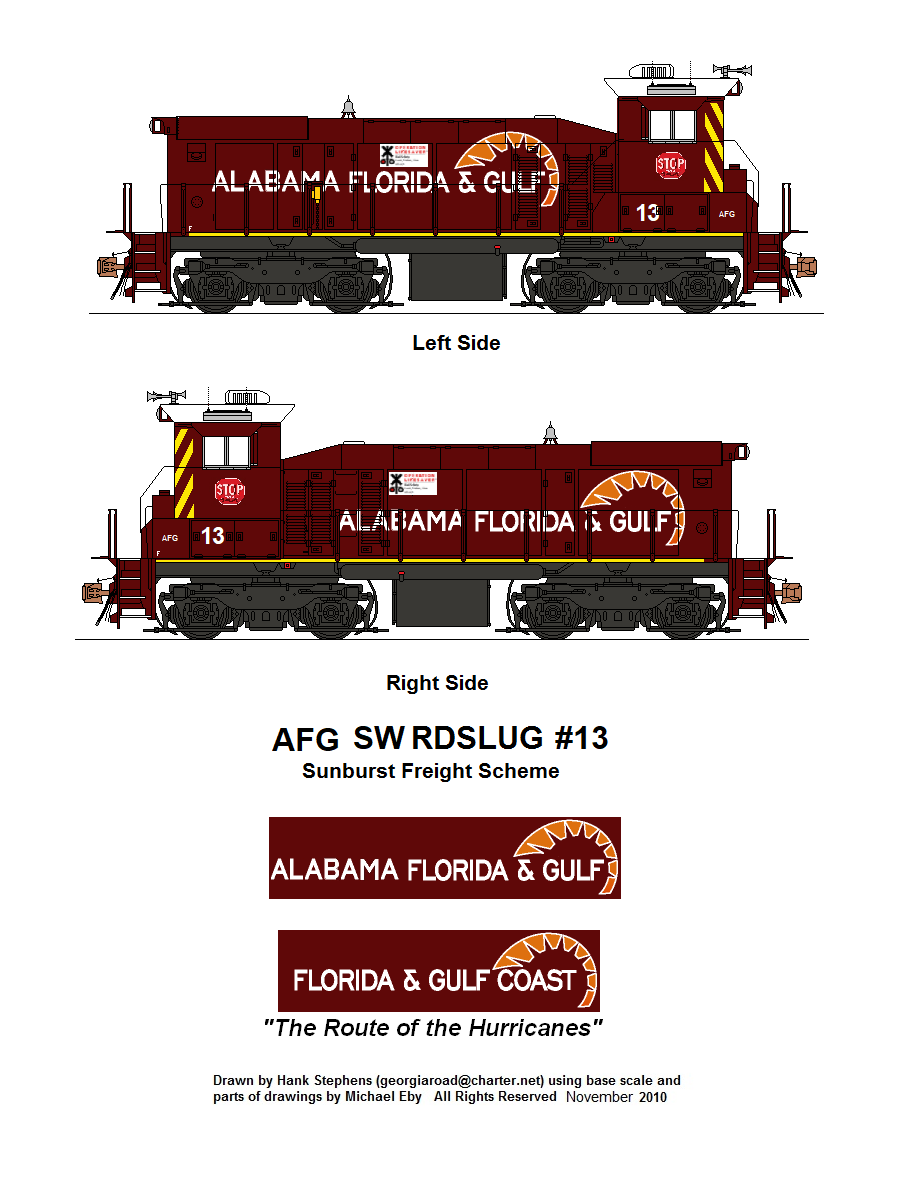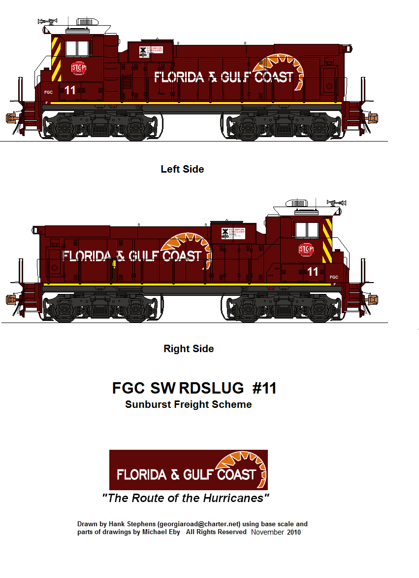 Road Slug use was not common on the Florida & Gulf Industries (FGI) AFG-FGC system until the Alabama Midland RR (AMRR) joined the fold in 2018. Due to the light branches and slow speeds on much of the Georgia-Alabama Grain Unit lines, AMRR used road slugs reduced wear on branches and allowed consistent movement of large heavy cuts of cars on the lines. As the FGC and AMRR rosters blended and mixed over the new combined system, AMRR slugs were tested on the FGC, and found to be perfect for heavy switching assignments across the system. As a result, FGI worked with Stephens Railcar to standardize the configuration to make motive power assignments easier across the FGC system.