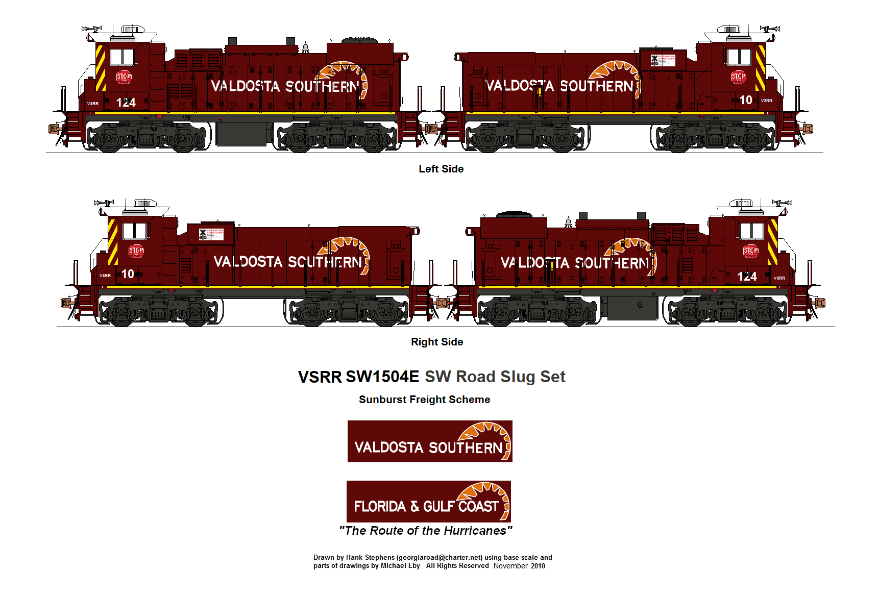 | VSRR 10 FGC 11-12 | 3 | Sunburst Standard Scheme | exx-NdeM, ex-HLCX; Acquired 1/2016; These units heavily damaged in derailment on CSXT in Century, FL while in transit to FGC at Pensacola. units stored HBO at Tallahassee, FL and stripped for parts; sent to Stephens Railcar for conversion into SW Road Slugs; units in service paired with GP40-2 and SW1500s; Unit #10 transferred to VSRR and mated to VSRR SW1500. |