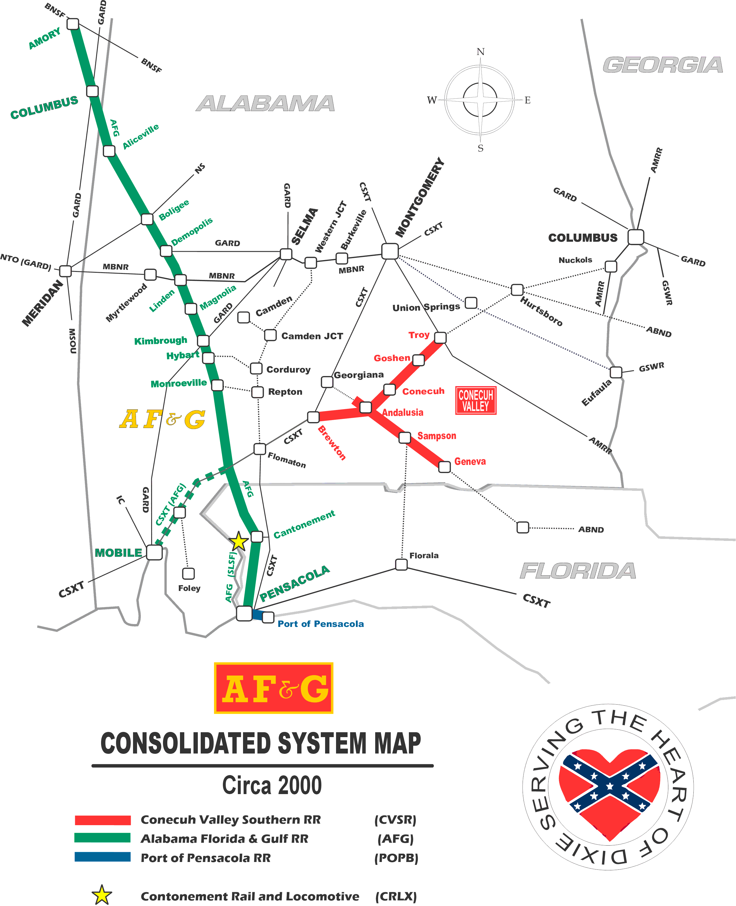 The Conecuh Valley Southern Railroad (CVSR) is a legacy short line started as an independent subsidiary of the Alabama, Florida & Gulf RR (AFG) in 1986. The lines that made up the NS spin-off railroad were light density, with traffic centered around Union Springs, Troy, Goshen and Andalusia AL. It would later acquire the Alabama & Florida RR line from CSX in 1988. Power was a collection of four CF-7 units and an occasional leased Geep from the AFG. As the AFG reimagined its operations by acquiring the former BN lines between Amory MS and Pensacola FL the decision was made to leave the CVSR as its own entity. AFG chose to keep the line at arm’s length, allowing it to keep operational and decision making control locally. The tenuous nature of these long neglected lines required overhead to be kept as low as possible in hopes the CVSR could survive on a dwindling traffic base. The CVSR was based in Troy AL and controlled much of the old CofGA western branch lines from Columbus GA into Andalusia AL . It also purchased the CofGA line from Eufaula, AL to Montgomery AL, crossing the western line at Union Springs.