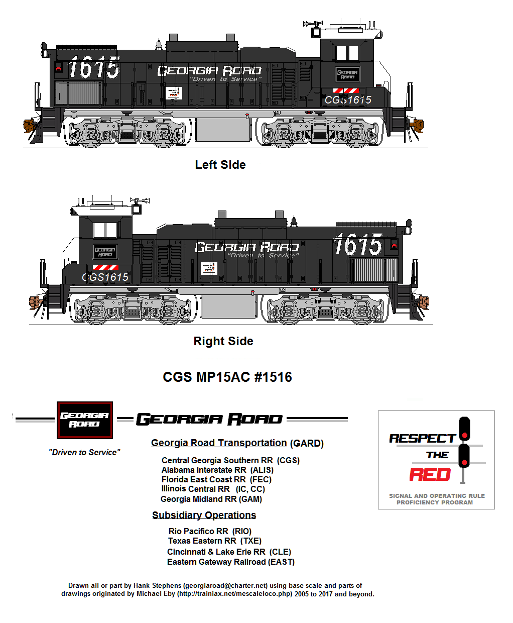 In the modern era where most Class One railroads are slowly retiring their end cab switchers for heavier and more flexible six axle power, Georgia Road continues to employ a substantial fleet in various terminal locations on the system. Georgia Road added ex-NS, exx-SOU units with the purchased two former NS classification yards in the early 2000s on its Central Georgia Southern RR (CGS) and Alabama Interstate (ALIS) subsidiaries. These units were late production units, most equipped with the later silenced exhaust. These units mixed freely with former Soo (ex-MILW) MP15AC and former SP units.