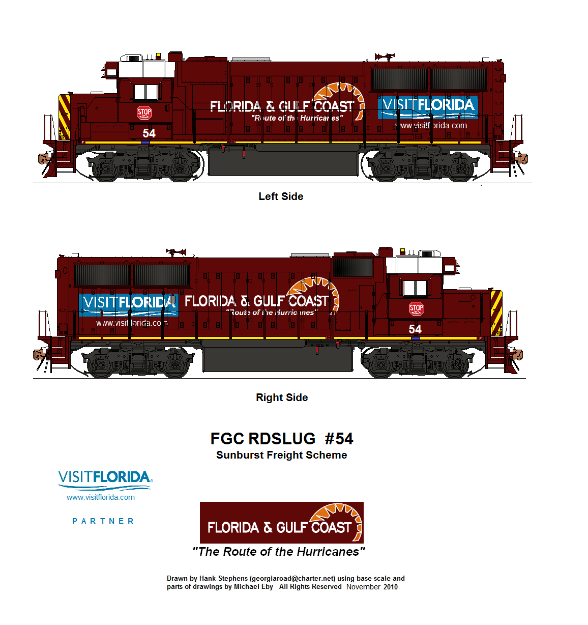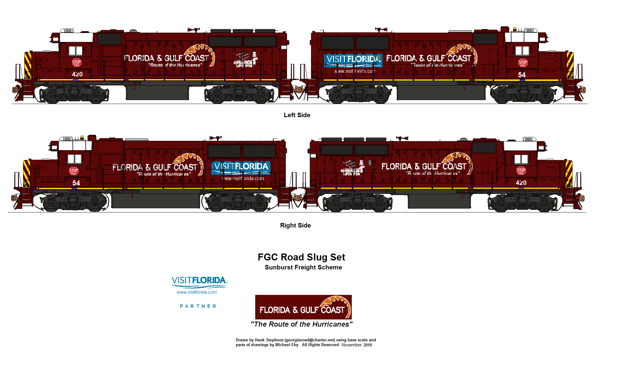 Road Slug use was not common on the Florida & Gulf Industries (FGI) AFG-FGC system until the Alabama Midland RR (AMRR) joined the fold in 2018. Due to the light branches and slow speeds on much of the Georgia-Alabama Grain Unit lines, AMRR used road slugs reduced wear on branches and allowed consistent movement of large heavy cuts of cars on the lines. As the FGC and AMRR rosters blended and mixed over the new combined system, AMRR slugs were tested on the FGC, and found to be perfect for US Sugar operations and heavy switching assignments across the system. As a result, FGI worked with Stephens Railcar to standardize the configuration to make motive power assignments easier across the FGC system.
