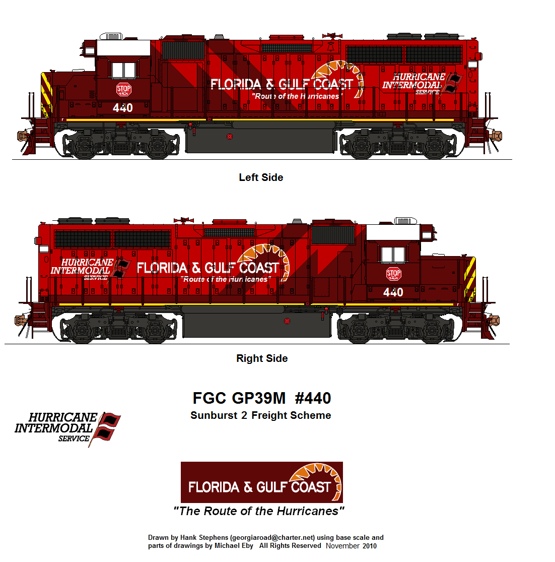 | FGC 440-443 | 4 | Sunburst 2 Standard Scheme | Former Georgia Road 25M Rebuild Program GP25M units purchased in 2019 for Hurricane Intermodal Service. FGI re-designated model to GP39M; all in Sunburst 2 Paint scheme |