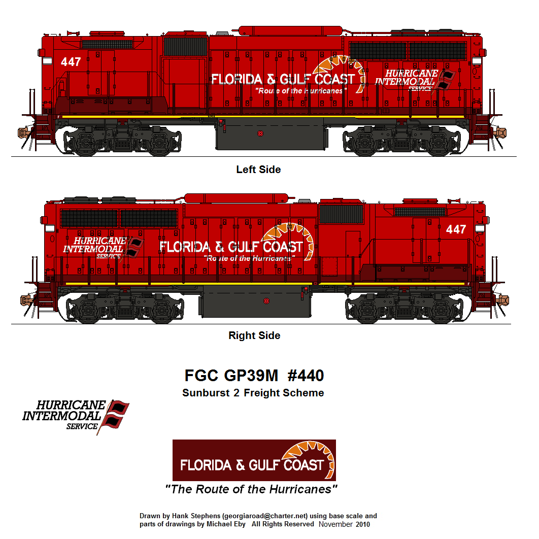 | FGC 444-449 | 6 | Sunburst 2 Standard Scheme | Former Georgia Road 25M Rebuild Program GP25B units purchased in 2019 for Hurricane Intermodal Service. FGI re-designated model to GP39MB; all in booster unit modified Sunburst 2 Paint scheme |