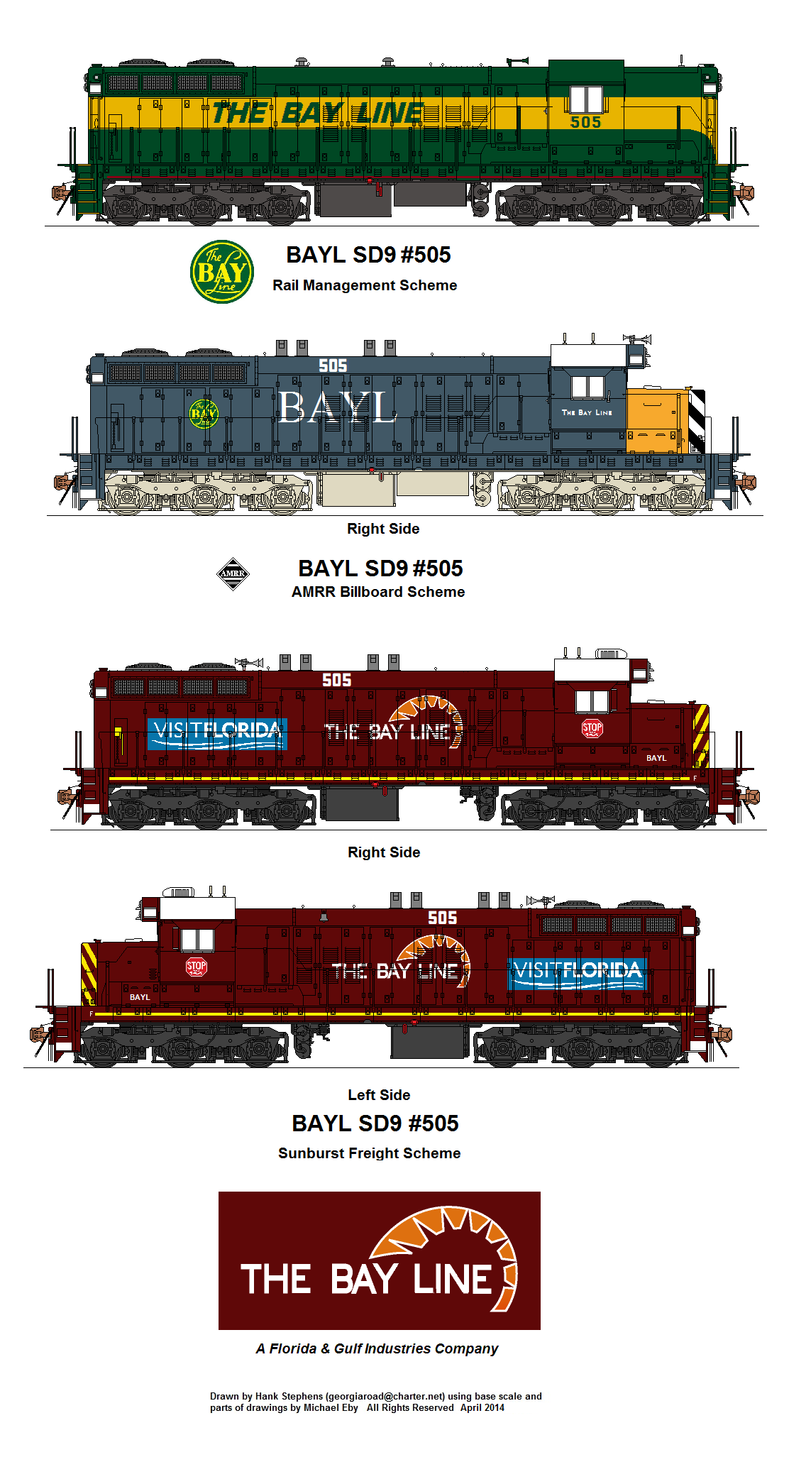 The first group of early SD units came by way of the acquisition of the Rail Management owned Bay Line Railroad (BAYL). The paper mill owned railroad sampled new EMD units over its near 100-year history as the original Atlanta & St. Andrews Bay Railroad (ASAB) and later the Bay Line Railroad (BAYL) when the road was renamed and sold to Rail Management. Two SD9 units came as part of the original ASAB roster, #504 and #505. Both SD-9L units #504 and #505 were involved in a derailment at Youngstown, FL in 1978. 504 was repaired and put back in service with little changes. 505 was severely damaged and sat behind the BAYL main shops at Panama City, FL for several years. It was eventually rebuilt complete with a new EMD SD40 series main cab and nose.
