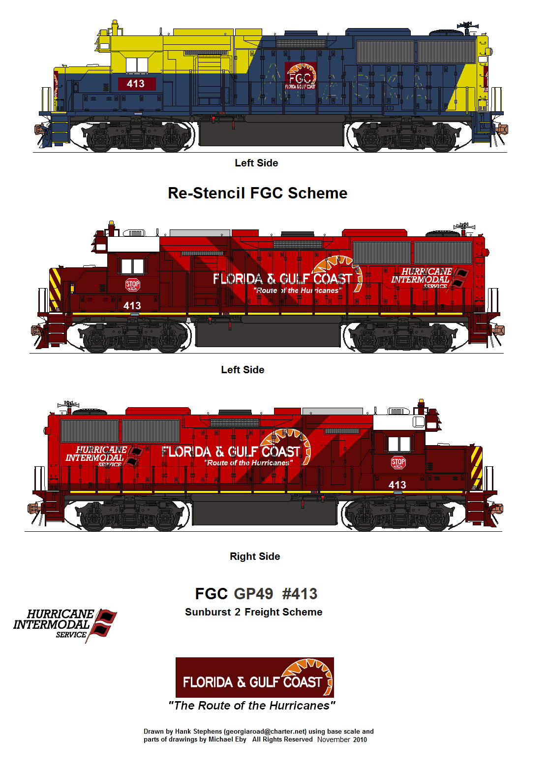 In 2018, Florida & Gulf Industries (FGI) launched its Hurricane Intermodal Service shortly after purchasing the Florida & Gulf Coast Railroad from MDRail Transportation. This regional service was intended to link the Big Bend and Panhandle areas of Florida to the nationwide Georgia Road QuickSilver Intermodal at its terminal in Birmingham, AL. The idea was to create regular service as an extension of the QuickSilver hub and spoke network where long distance intermodals fed regional hubs which in turn linked smaller terminals in a “slingshot” service with short, fast and frequent ramp times matched to these connecting routes. Along with ex-TM GP60s from HELM, GP25M and GP25MB units were purchased from Georgia Road. In addition, FGI found four former Alaska RR (ARR) GP49 units coming off a canceled lease from the Cincinatti Eastern (CCET). ARR was the only railroad to run this model, and they were purchased mainly to pull new cruise trains out of Anchorage to the Denali Park resort. As the cruise business grew, trains were longer and ARR decided to replace the GP49 units with larger SD70MAC units. The ex ARR units were acquired by Indiana Boxcar Corporation (IBCX) after larger dealer/lessors deemed the units marginally useful for short line operation. Four units went to the CCET as startup power for the new short line but the high gearing and ARR specifications designed to deal with extreme winter conditions proved a handicap.