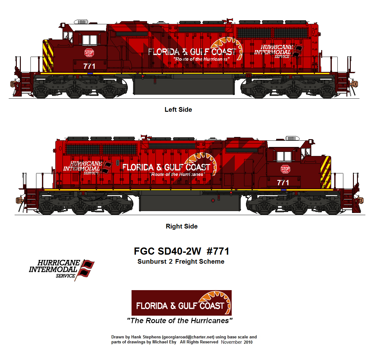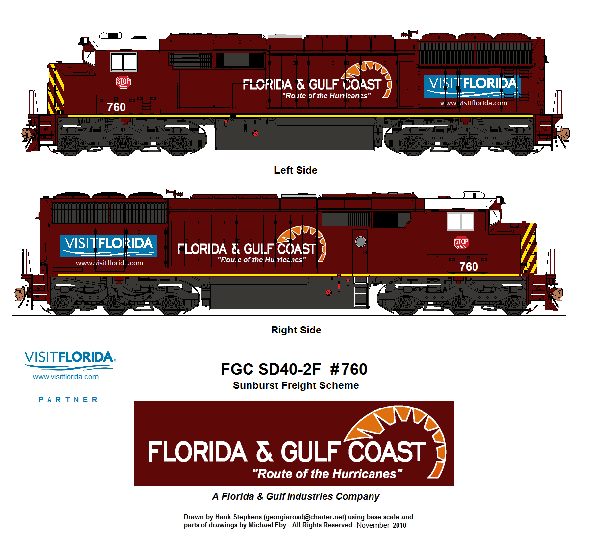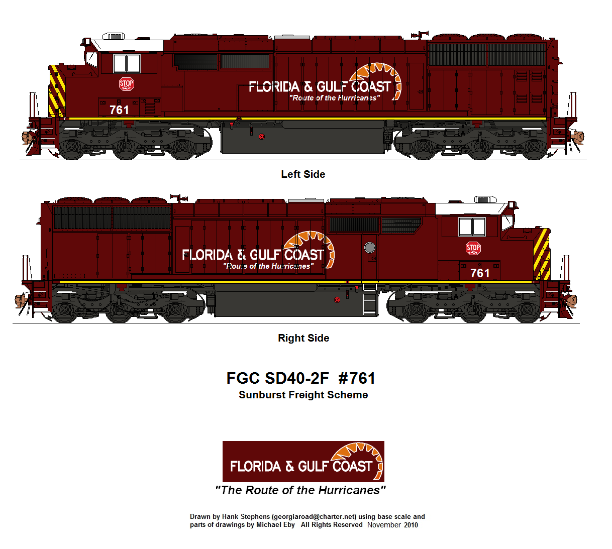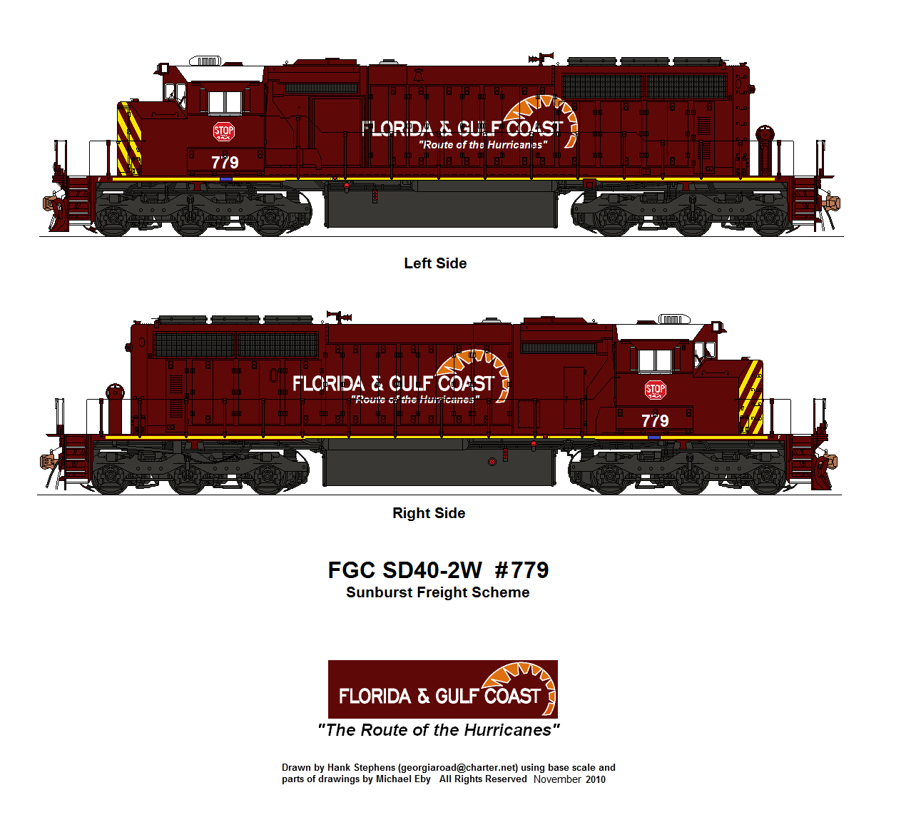 | FGC 767-768 | 3 | Sunburst Standard Scheme | ex-CP acquired 3/2020; Assigned to general service; 767 and 768 out of service stored at Tallahassee, FL with failed primemover and crankshaft failure, respectively. |