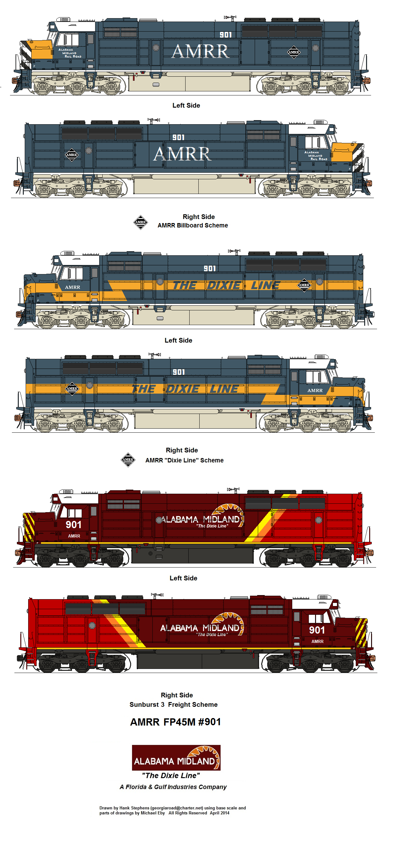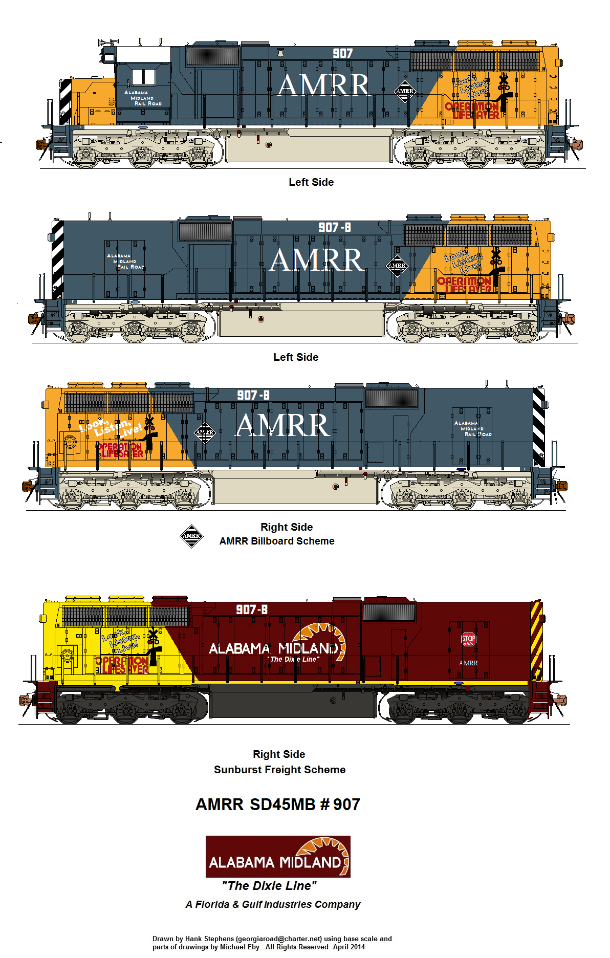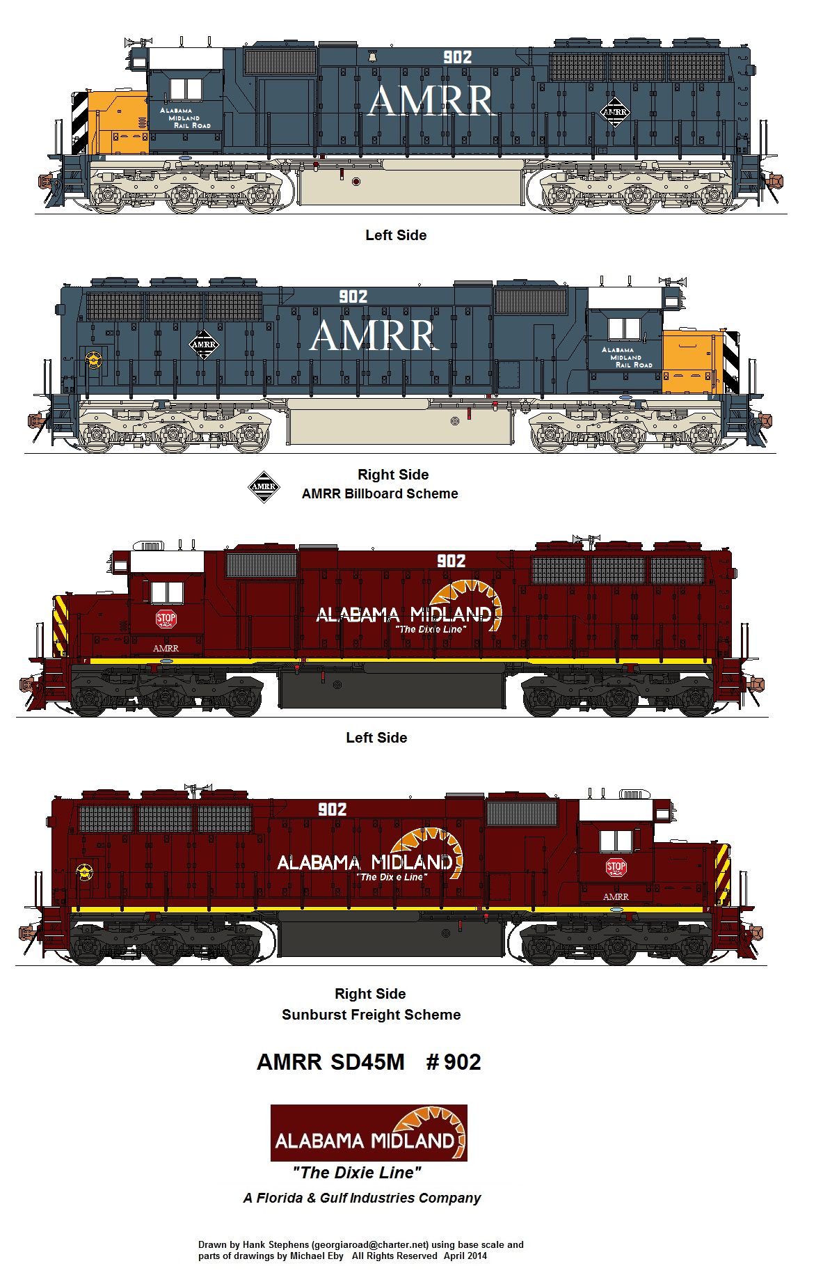 The 900 series units comprise the original backbone of the Alabama Midland Railroad (AMRR). The series became a catch all for all 3000hp six axle locomotives comprising a handful of true SD40-2s and many 45 series units rebuilt to SD40-2 standards. The AMRR and the later Florida & Gulf Industries (FGI) controlled AMRR made no distinction in the external differences since all units were based on the EMD 645 series primemover and 40 series Dash Two upgrades. These units were purchased for manifest interchange trains and unit grain movements over the “trunk” line between Thomasville, GA, Dothan, AL and Montgomery, AL. A few found work on the heavier rail branches in middle Georgia but were quickly replaced with four axle power once FGI took over the AMRR and combined the two rosters.