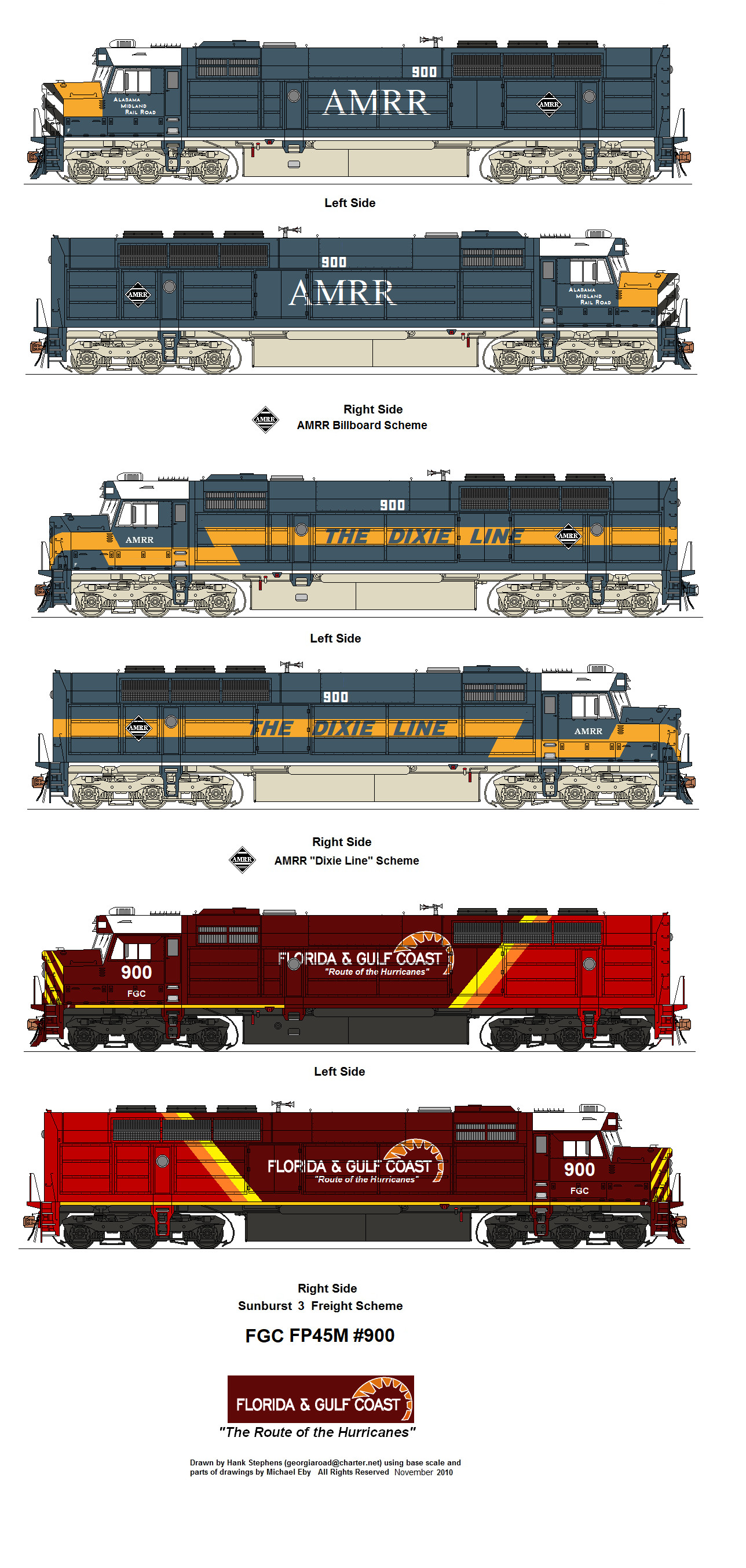 | FGC 900 AMRR 901 | 2 | Various schemes | exx-MILW, ex-HLCX; Acquired 1/1997; These FP45 units remanufactured by Stephens Railcar into SD40-2 specs 2 in 2003-2006; Units built without dynamics and not retrofitted during rebuild; assigned general service and OCS; 900 transferred to FGC for repaint into FGC Sunburst 3 paint: 901 painted in FGC Sunburst 3 paint; Both in Service assigned to OCS or Hurricane Intermodal Service. |