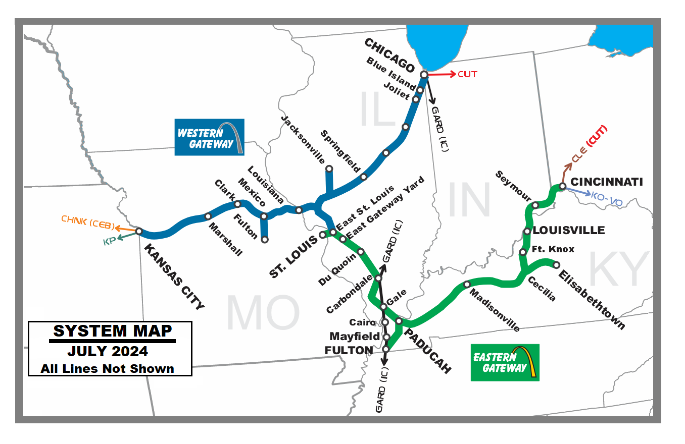 Commodities hauled range from manufactured goods such as new import automobiles, Amtrak directed passenger service, agriculture and basic building materials, timber and paper traffic, coal and manufactured goods. The principal system shops are at newly upgraded EAST Gateway Yard in East St. Louis. Terminals are also located in Cincinnati and Paducah with primary interchanges at Cincinnati (the CLE). Kansas Pacific (both KP and CHNK) East St. Louis (the GARD/IC lines) and Fulton (GARD/IC lines. The railroad operates automotive distribution and regional intermodal hub along with large transload operations in major cities across the GATEWAY SYSTEM.