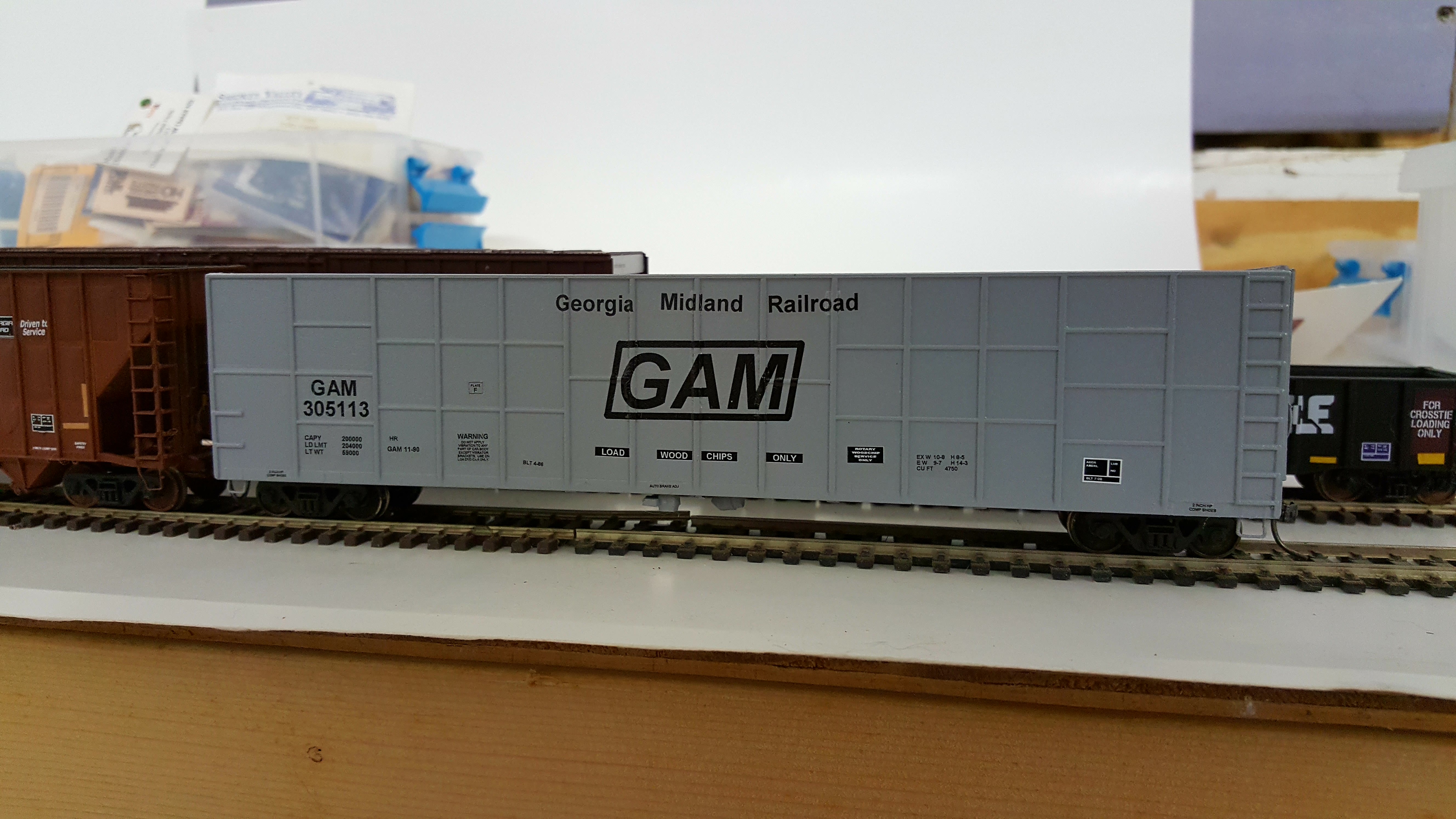 A re-stenciled Tangent model of an outside braced woodchip car carries reporting marks of lessor Stephens Railcar Leasing (SRCX) and augments Georgia Road owned cars in pools.