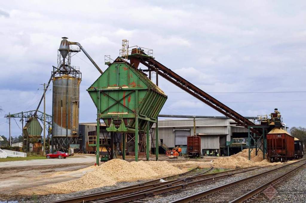 Southeastern woodchip railroad business comes in two forms, the chipping plant and the traditional sawmill operation. Both produce woodchips. The chipping plant is purpose built to create woodchips in large quantities to supply regional paper mills. These are located some distance from the mills, usually in areas where timber reserves are plentiful. These mills are relatively simple in design and can be up and running in a short time. Logs are brought in by truck and unloaded by log cranes. These cranes stage logs and feed the debarker/chipper. Bark stripped from the logs is loaded on trucks for sale to the landscape industry or in some cases, burned for power. Woodchips are loaded into strings of woodchip hoppers and moved by rail to the paper mills. Some mills rely on these outlying chip plants to supply the bulk of their input woodchips. Larger paper mills often time use these plants to augment wood brought in by truck locally.