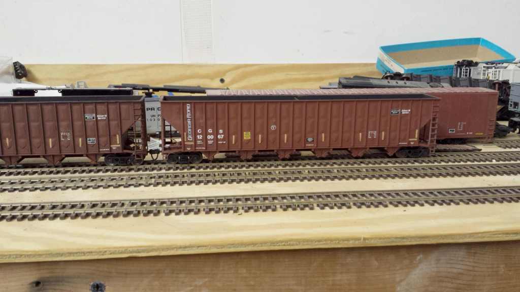 A gray predecessor painted GAM rotary car built originally for SP by PACCAR This class had its end doors replaced with fixed ends and car was strengthened for rotary dump service.–E&C Shops model with new trucks, couplers and weighted interior.