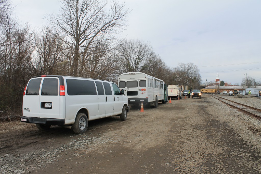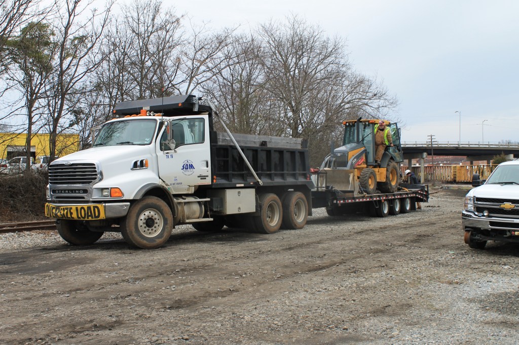 The Kershaw ramp is nothing more but a surplus intermodal flat that the railroad suppliers for Kershaw to mount its patented Scorpion Ramp assembly. The name comes from how it unrolls, similar to how a Scorpion rolls up its tail when moving. A small diesel engine mounted under the flatcar runs a hydraulic pump that powers the hydraulic pistons that unfurl the ramp. unfolds with the pull of a few levers, latches on to the rail automatically and is ready for use in less than an hour. The equipment could then immediately run the ramp and load onto the transport flats. This eliminated hours of hand building a loading ramp, eliminated the extra equipment and weight and literally revolutionized the flexibility of the gang transport trains. The ramp had rails flanked by wheel plates and could load both rail borne and rubber-tired vehicles. I watched a CSX gang load in less than two hours including tying down equipment on their transport flats. Since they camped in hotels, the need to break down camp was unnecessary. They were “one and done” at a blistering pace compared to what we faced on T&S 1 in the 1990s. CSX literally loads everything from the machines, to backhoes, grapple trucks, contractor dump trucks, trailers and even pickups, crew vans and buses. If the ramp is placed at a road crossing, everything can be unloaded at one and in the order to immediately begin production.