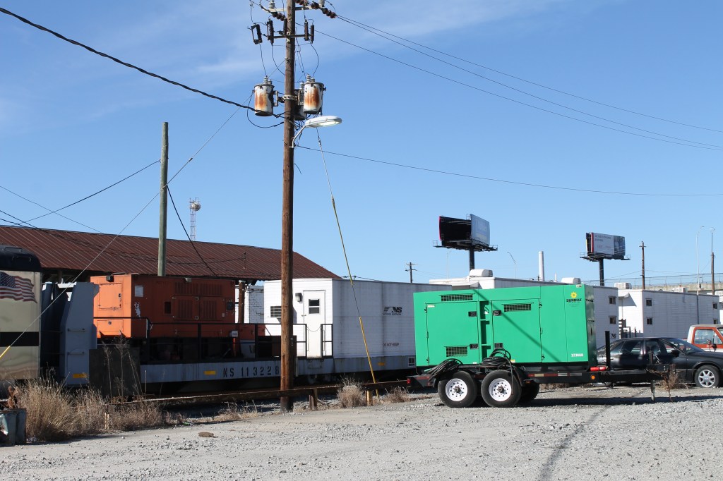 The two pictures above represent the camp of NS T&S 2, a standard sized tie and surface gang typical of Norfolk Southern in the mid 2000s. With the maturation of cloud based IT accounting and highly automated mechanized machinery, a standard gang is small and compact. This gang was working the Central of Georgia Railway P-Line from Columbus, GA to Birmingham, AL. This was my old work district, and to this day remains as a secondary line with little traffic. The camp was located at the remains of the CofGA Columbus Yard at the idle car shop lead. Apparently, the generator mounted to the repurposed pulpwood rack turned gang generator car was having issues, and a lease unit on a trailer was actually providing hotel power to the camp. The generator shares the old pulpwood conversion car with a half sized Univan that contains power control panels and feeders that run the length of the camp train. This allows each car to be isolated if needed for transport or repair/replacement.