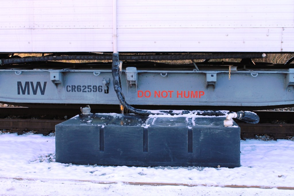 As noted earlier, toilet facilities were provided in the form of a row of portable toilets provided by a local contractor. These contractors usually removed the gray water generated by the showers and basins as well as maintaining the toilets. Gray water was collected in black holding tanks at each sleeper as seen above. During my time in the 1990s, gray water was usually dispatched onto the ground outside of the camp area via a long drain hose. Complaints by workers having to live with the dank smell of gray water running on the ground encouraged NS to capture the water and dispose of it properly. Potable water was pumped directly off contractor clean water tanker trucks moving water from a utility hydrant at the road. Trucks were filled, move to the camp cars and hooked directly to the potable water supply inlets. In most cases there is a camp car outfitted with pumps, pressure tanks and filters pulling directly from a pre-determined utility owned hydrant or water source. This eliminates all the manual water handling. R-11 was working short stints and being half a gang, hauled water so the camp could be closer to the work.