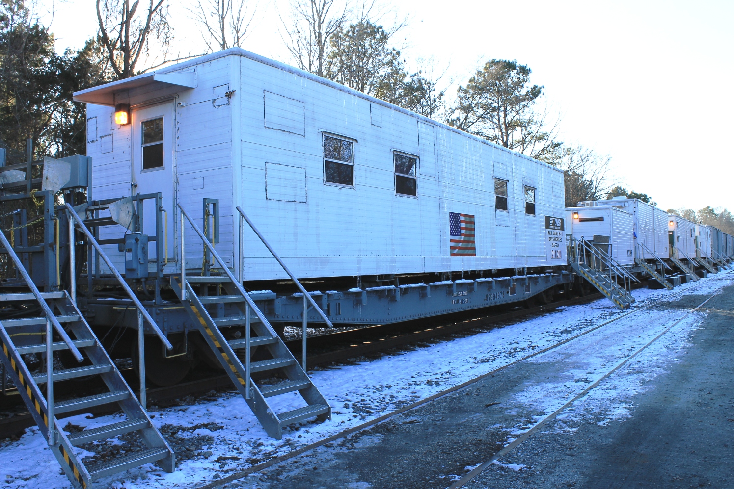 I chose this gang in particular as it provides a minimalist overview of a modellable camp. If the modeler desires, gang machines and equipment can be staged or work nearby. Since the gang uses buses and vans to shuttle gang members to the worksite, it would not be uncommon to have just the camp sitting on a siding or house track. The transport flats may stay with the gang or be stored in a nearby yard or suitable siding until called up to load equipment. If the gang travels machines between worksites instead of loading them for train transport, the transport flats may be held in storage at a terminal yard or remote track. There would be no need to represent the transport train at all. A small camp like that used by R-11 could be all that indicates program maintenance work in the area. Another interesting model would be the loaded-up train with camp cars moving on the mainline to a off layout worksite. CSX and NS move these trains all over the system on a regular basis.