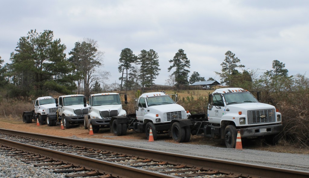 This section focuses on a particular gang in 2016 documented on the old CofGA P-line mainline between Columbus, GA and Birmingham, AL around 2016. The gang was the Norfolk Southern R-11 Rail gang camping 30 miles north of Columbus, GA at Bleeker, AL (pronounced bl-E-KUR). The camp location was chosen outside of the yard in Columbus, GA as the work started at Bleeker and continued north toward Birmingham, AL. East Alabama Water and Fire District had water hydrants at the road to supply water. The customary portable toilets lined up next to the camp train. The R-11 program was replacing and gauging worn curve rail with new rail strings dropped several weeks ahead of the gang arrival.
