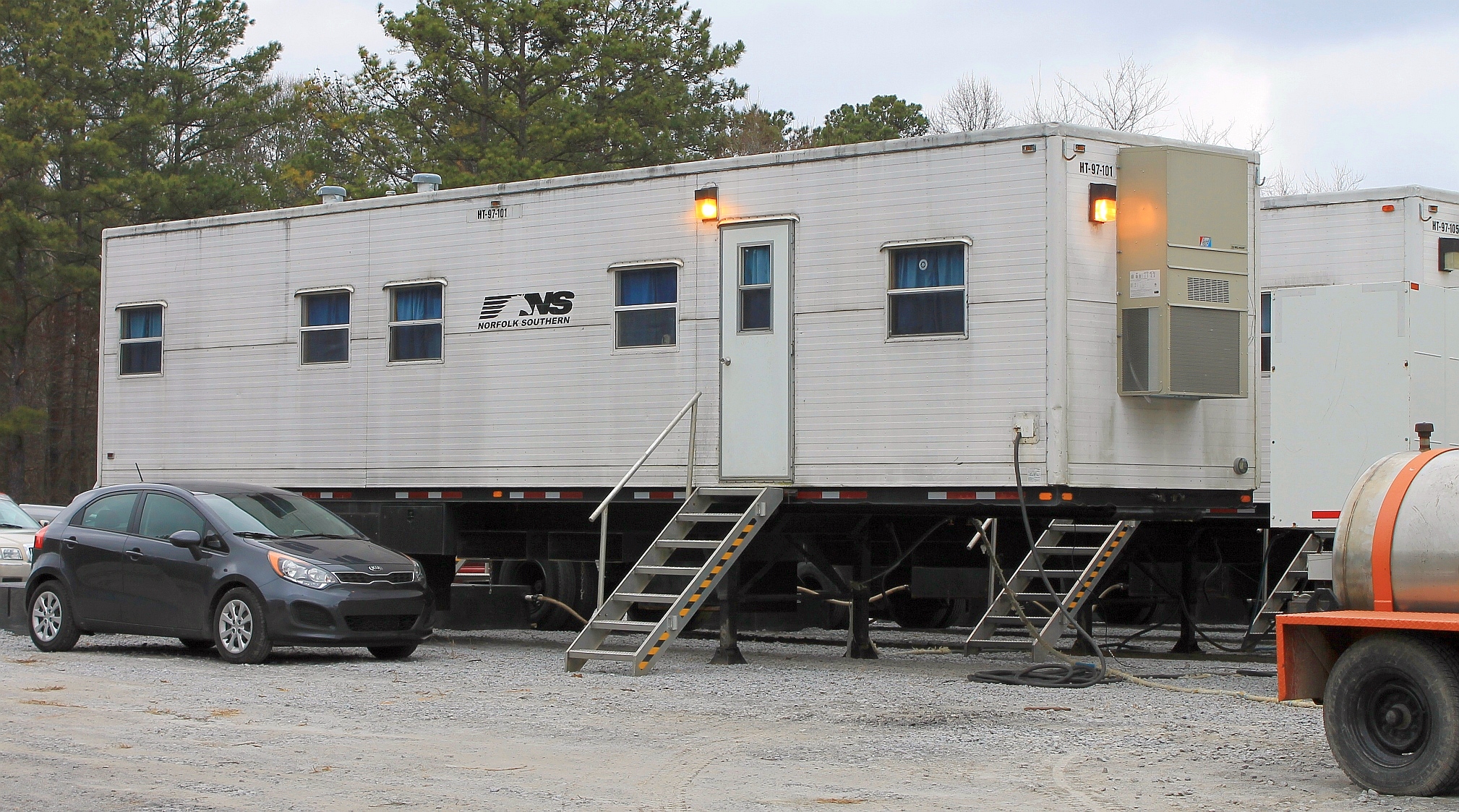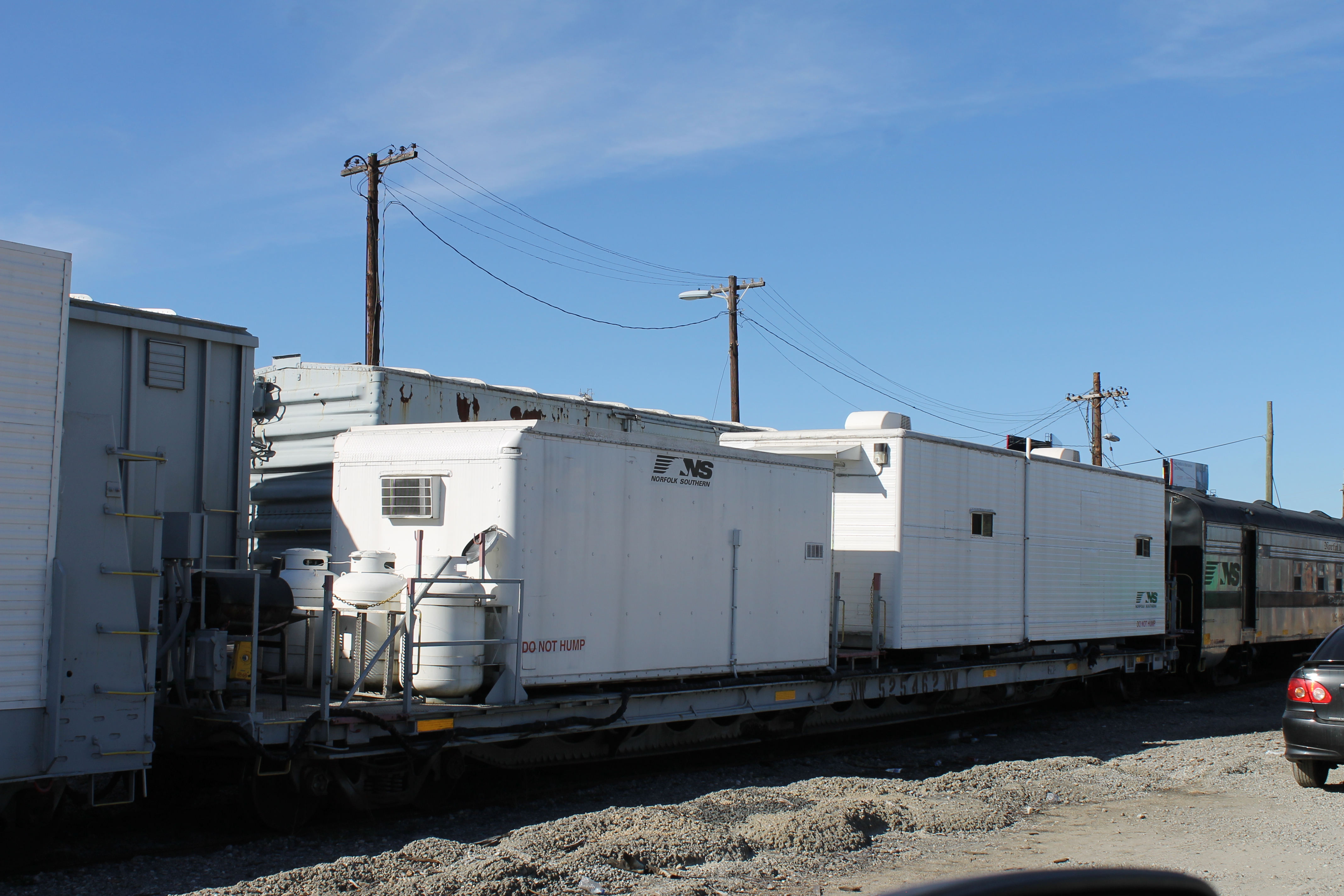 Potable water service for the gang is provided by this flatcar conversion. This gang relies on hook up to an outside water source such as a fire hydrant. Camps are located where water utility service is available. The stainless tank is likely a pressure tank to create water pressure for showers and basins. NS typical uses porta-potties rather than a shower toilet system with waste retention. Some gangs do have a dedicated shower and toilet facility car which operates much like a typical RV camper system, but on a larger scale. Unfortunately, there is some supposition here as my experience was systemically different when it came to water and waste service for the gang.