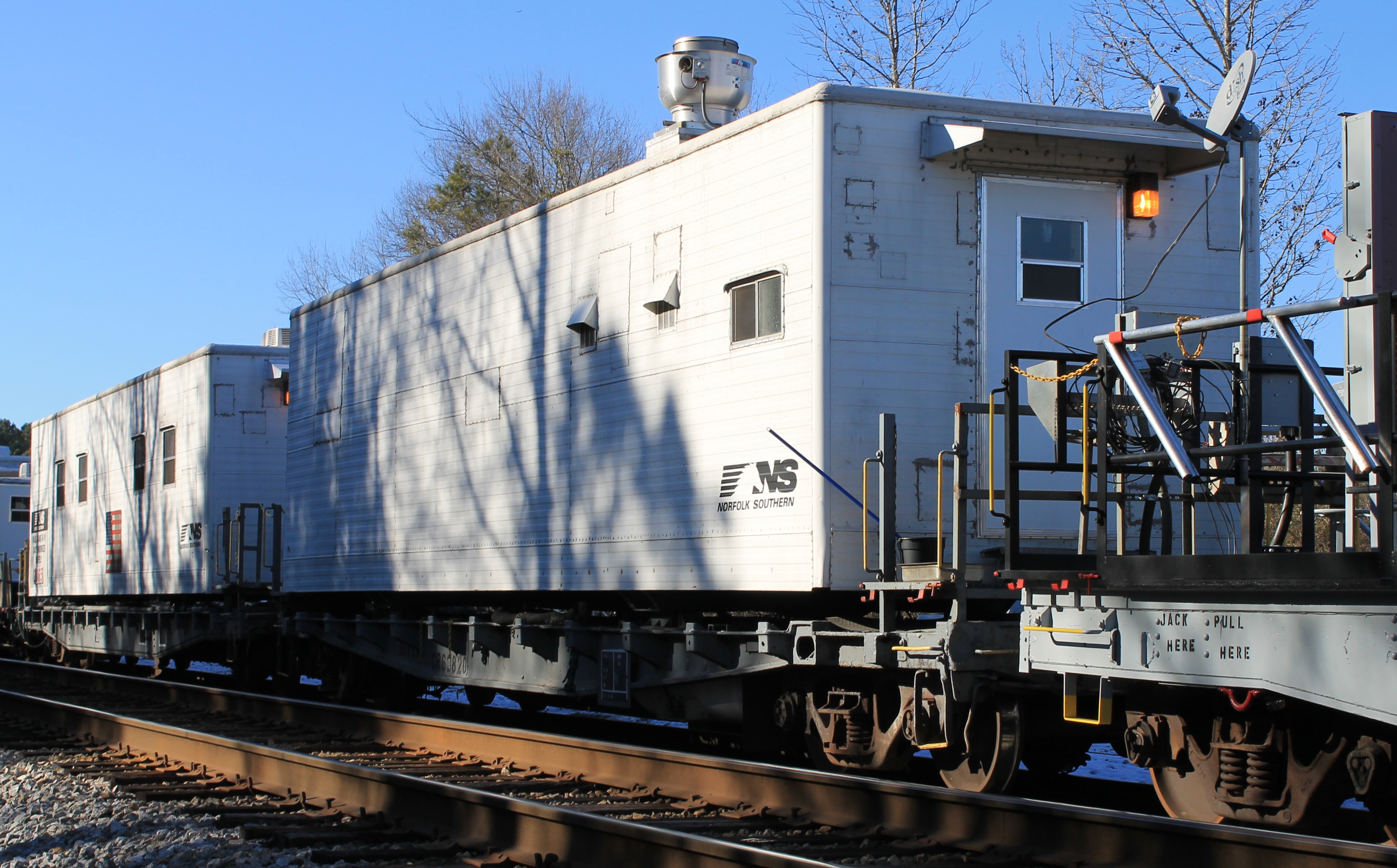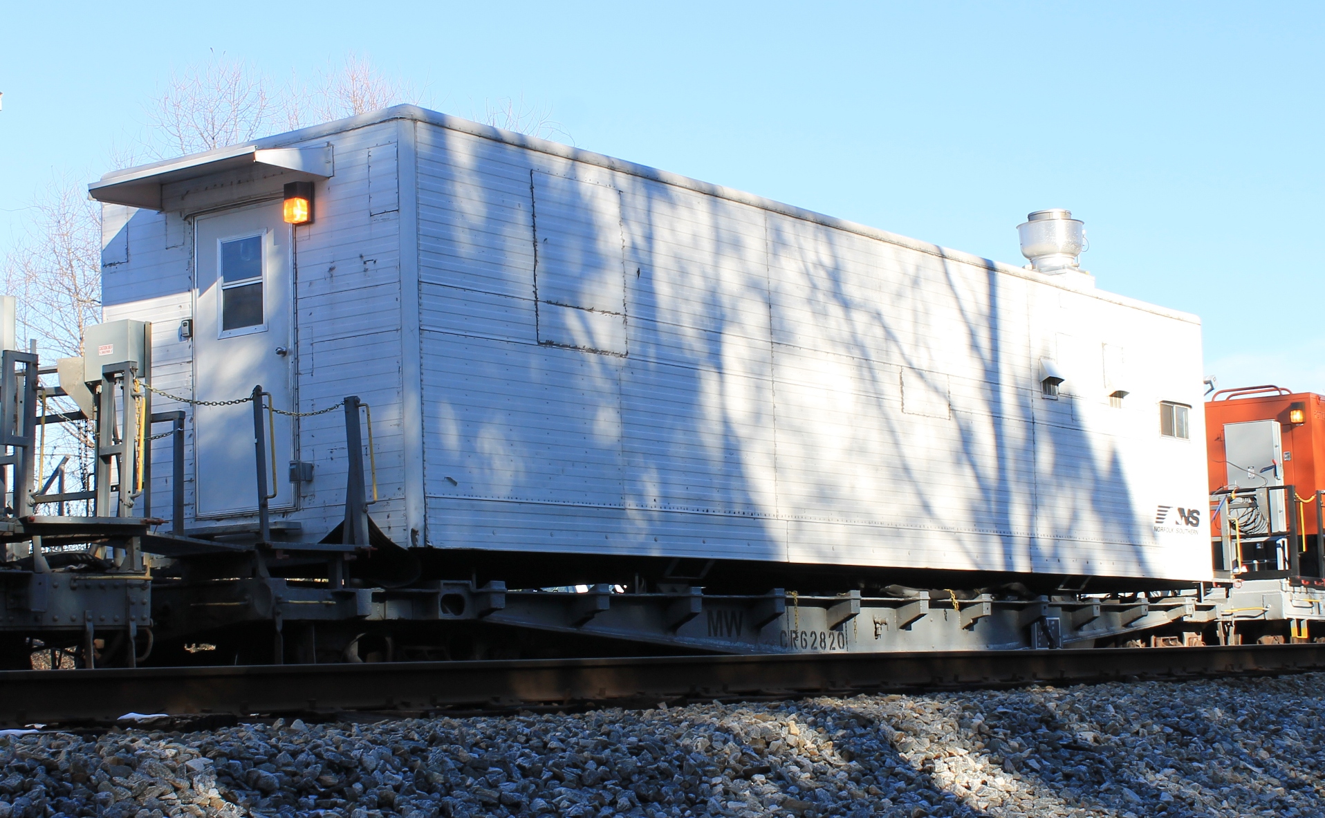 Occupying the sixth position of the camp train is an 86 flatcar that contains the food stores and the Cook Staff bunk. The car was so long I could not get it in one picture, so I settled for a panorama of three shots from left to right. From left to right is the 40ft Cook staff UNIVAN bunk, followed by the food stores and a deck area to grill or smoke food. NS quarterly set aside days for the gang to train and relax with barbeques and afternoon movies. These days helped break the monotony that set in when the gang worked multiple weeks in a row due to work window constraints on busy mainlines