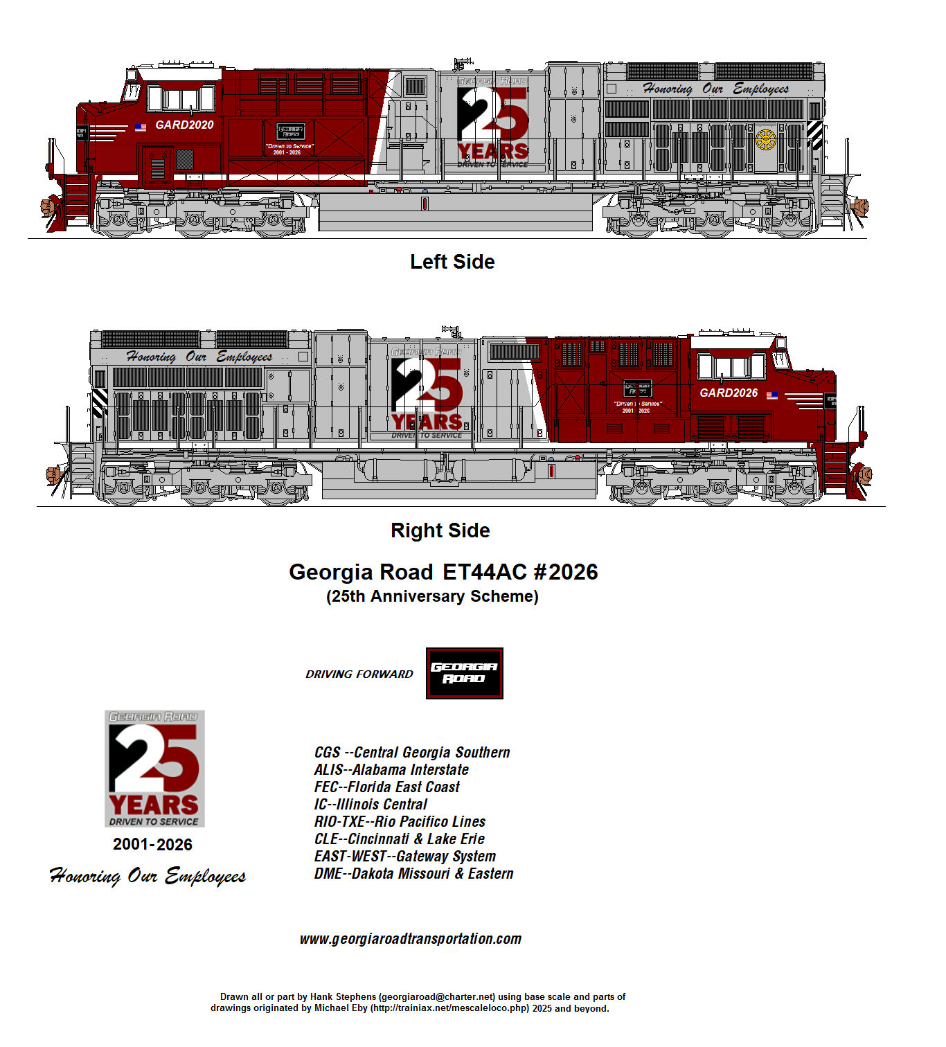The first locomotives to wear the new scheme will be new SD70ACe emissions credit units and new WABTEC-GE ES44-T4 units to be delivered in late 2024 and 2025. Brand new autorack railcars and unit grain hoppers earmarked for growing MexXpress Service will deliver over the next two years. All other locomotives and rolling stock will receive the new “Driving Forward” paint scheme as they are cycled through major rebuild or repairs. Georgia Road plans to have a significant amount of equipment with updated paint by the 25th Anniversary of the company in 2026.