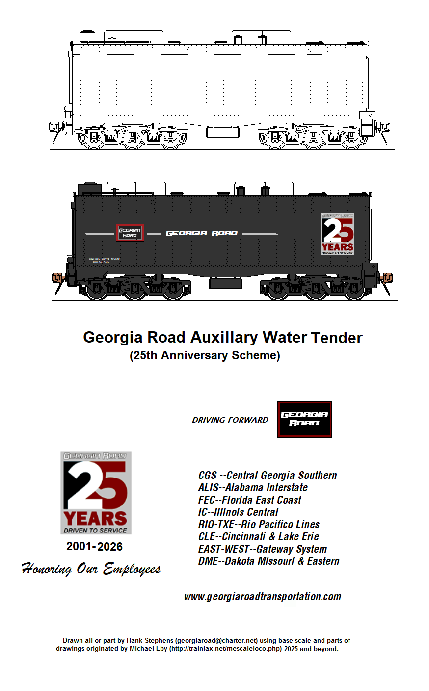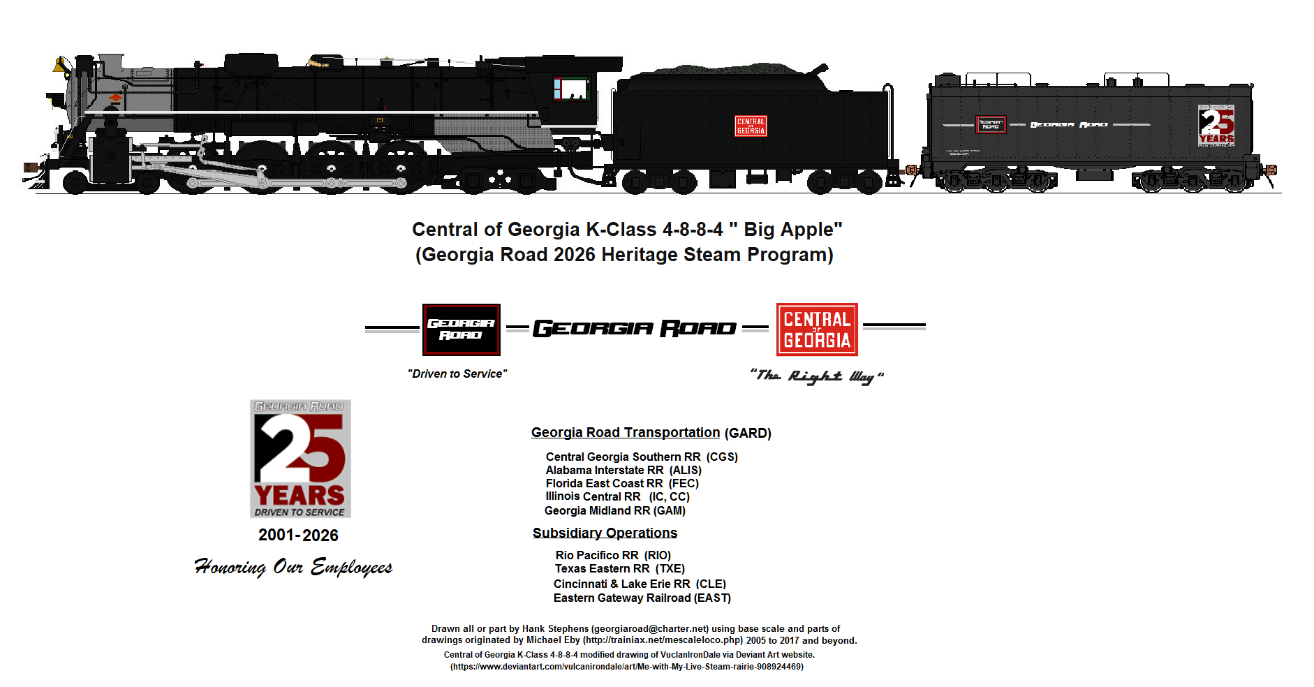 The announcement by Greenwood would be the first official recognition of the implementation of the Heritage Steam Program. A paint diagram concept followed by the physical appearance of a newly acquired former ATSF fuel oil tender the week prior to his Christmas address would be a clandestine harbinger of his announcement. It showed up at the Stephens Railcar John Tyler Locomotive Shops (JTLS) in early December and unceremoniously began restoration and conversion into an auxiliary water tender for the Heritage Steam consist. At the time of Greenwood’s address, the star of the program in the form of the last pre-war Central of Georgia Big Apple nicknamed Miss Scarlett was noticeably absent. Greenwood assured listeners that 2025 would be full of surprises and good tidings. For now, a few press releases and random concepts and shop pictures are all that is available.