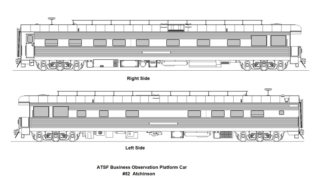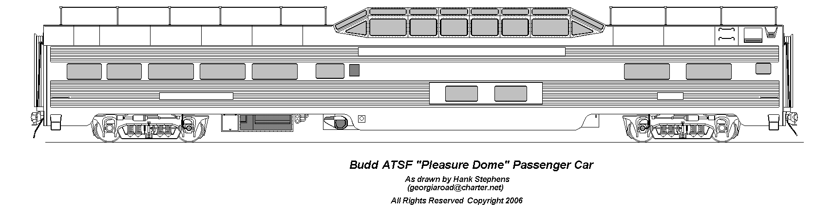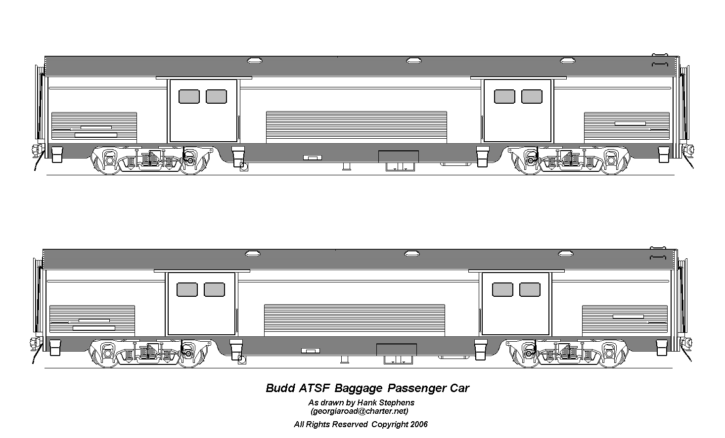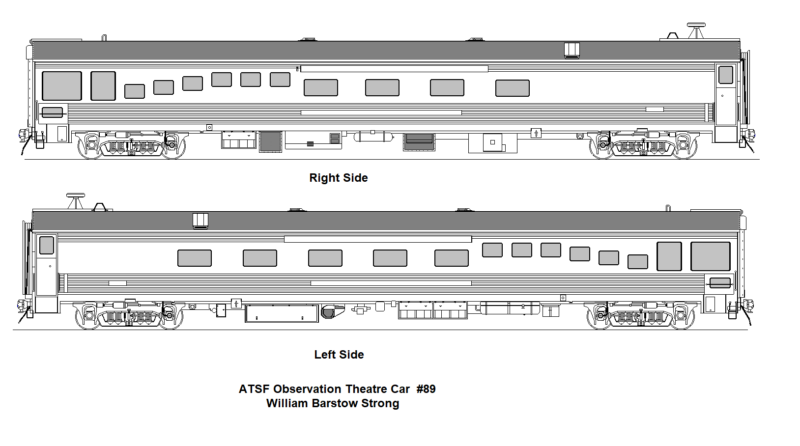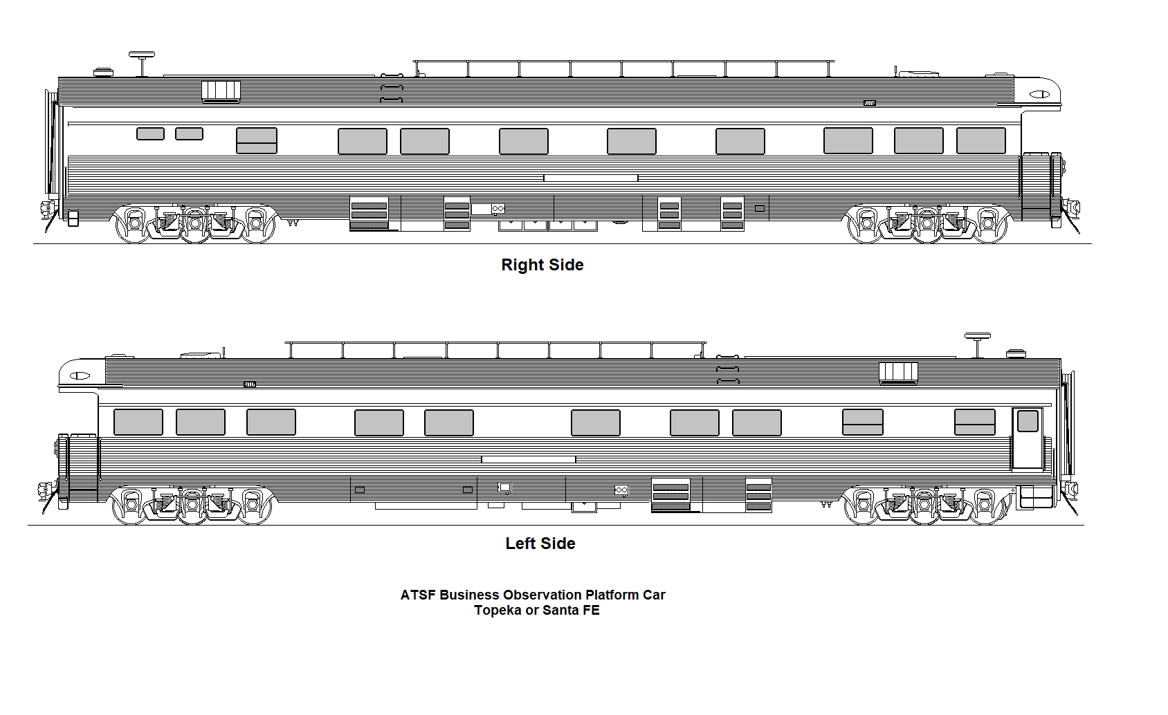 ATSF Budd Business Car AtchisonBudd ATSF baggage CarATSF William B Strong Theatre CarATSF Budd Business Car Santa FeBudd Baggage-Dorm NYC typeBudd 10-8 Executive SleeperP-S Articulated Kitchen/Diner/Lounge Freelanced based on SP prototypeBudd Hi-Level Chair Car (El Capitan)Budd Hi-Level Diner (El Capitan)Budd Hi-Level Lounge (El Capitan)Budd Hi-Level Step-Down Dormitory Chair Car (El Capitan)Budd Business Observation CarATSF Transition Dormitory Lounge (El Capitan)Budd Dormitory Lounge Car( NYC version)EMD E9A-E9B(HEP) Business Train ConfigurationEMD SDP40Fwith HEP UpgradeEMD SDP40F as built AMTK versionGE P30CH AMTK versionEMD U30CG ATSF versionBudd Great Dome Observation Car ATSF VersionBudd Baggare Dorm CarBudd Pleasure Dome ATSF version Super ChiefP-S Business Observation Car MP versionSP Daylight 3/4 Dome